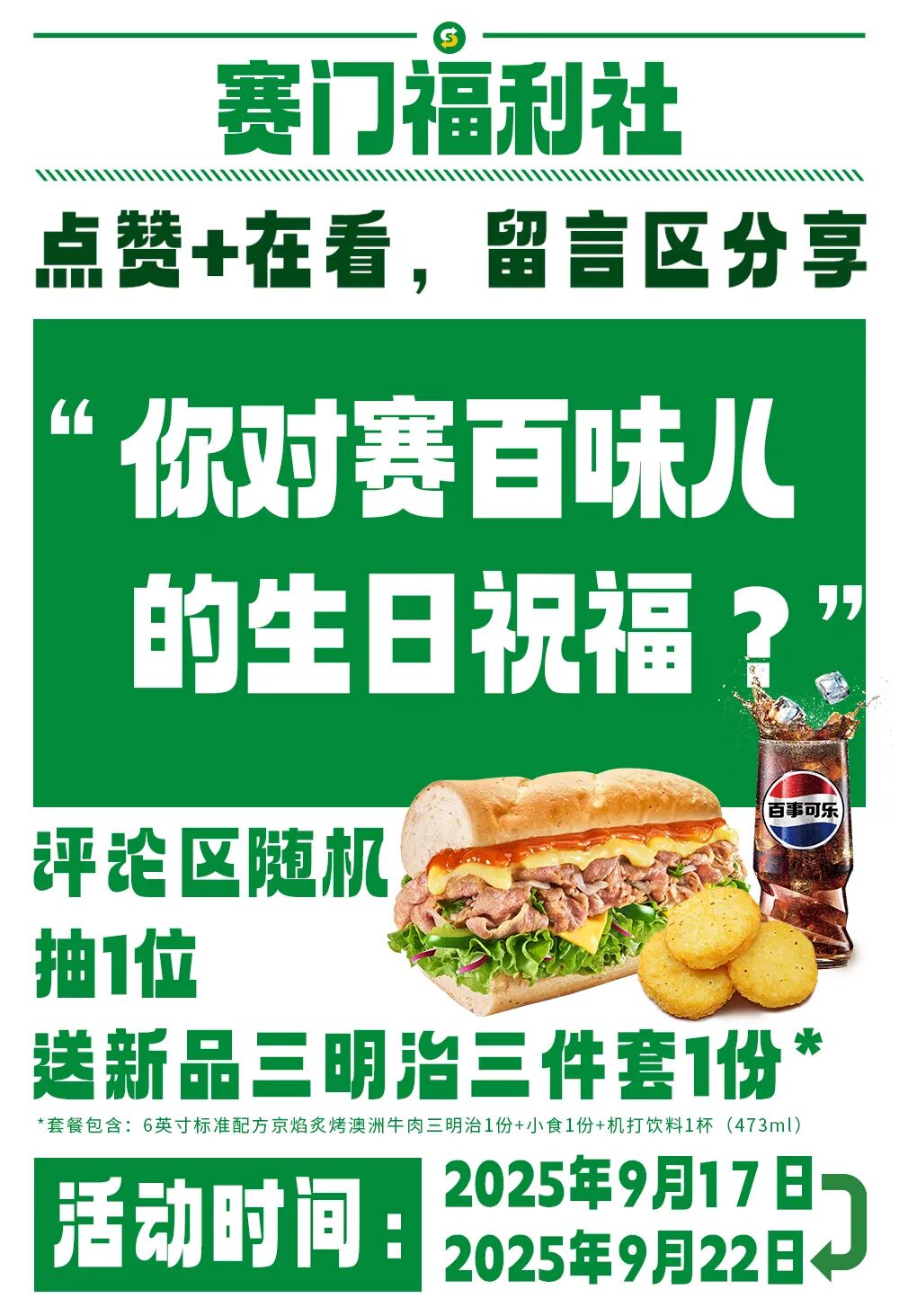 *上述产品限2025年09月17日到2025年11月18日于SUBWAY赛百味中国大陆地区部分多厅供应,机场、火车站等交通枢纽餐厅、旅游景区餐厅、圆区内部假厅等特涨餐厅除外,具体以餐厅公示为准。产品以实物为准,以上为创意圈片,仅供参考。SUBWAY赛百味可以在法律允許的范围内对活动进行适当调整。Subway® is a Registered Trademark of Subway IP LLC © 2025 Subway IP LLC.