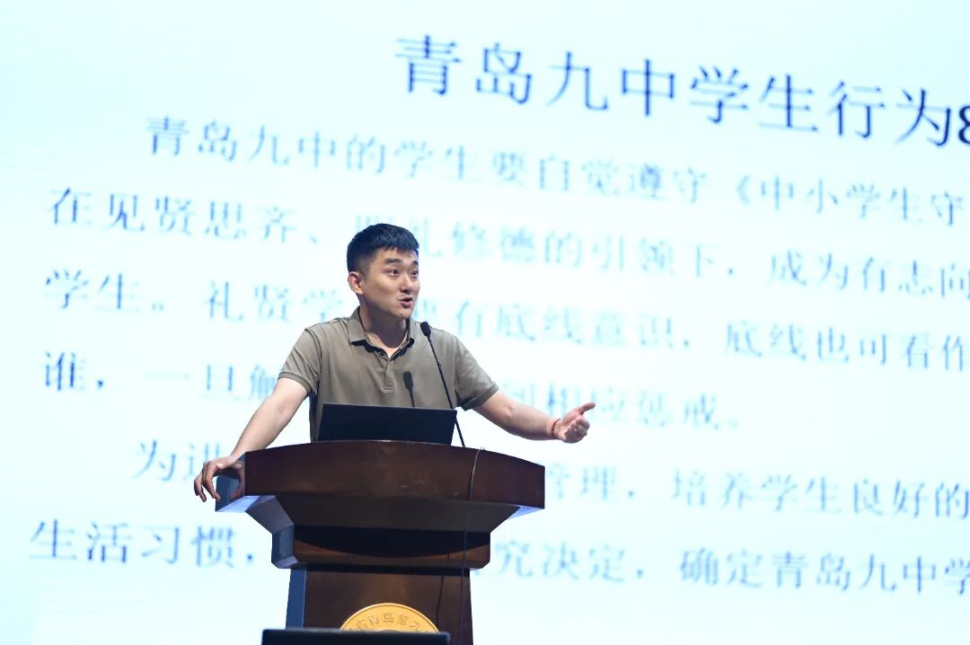 大会进行第三项,由青岛九中教学处主任,高一年级主任姜龙方主任对近期工作进行总结。姜主任对常规化管理进行了着重强调。“做好常规化管理,培养良好的学习习惯是高一年级的第一要务。关注平常生活中的细节,对细枝末节的坏习惯做好处理,有助于同学们在接下来的学习过程中更上一层楼!”之后,姜主任再次重申了青岛九中学生行为守则8条底线,对每一条“红线”都做出了详细的讲解分析。此外,他还对最近发现的违纪行为进行严肃批评处理,并对之后的常规提出了明确规定,严惩违反8条行为底线的同学,以捍卫积极向上,健康正向的礼贤校风。