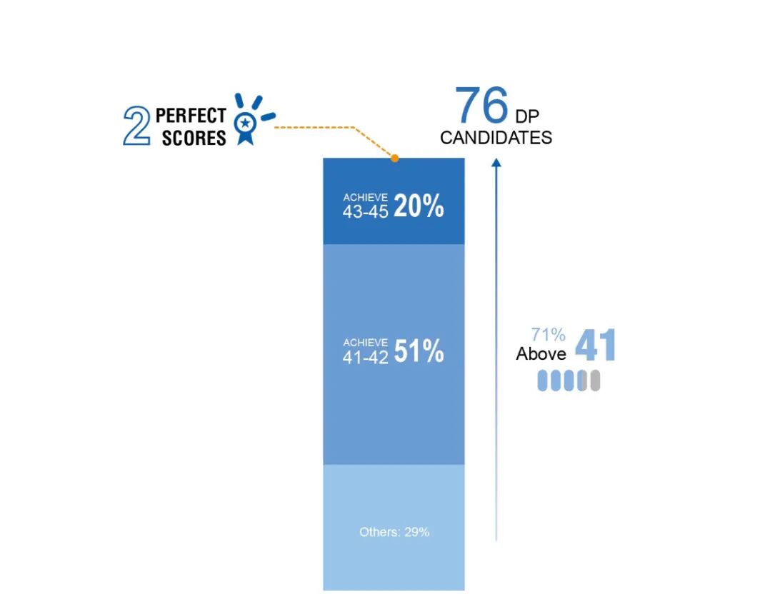 80%以上的IBDP考生获40分以上(满分45分)的成绩 [全球:9.3%], 2名同学获得满分45分,全科总分均分则再次突破41分。值得一提的是,上中国际部自2011年起至今已经连续15年,IB全科总分均分超过41分。