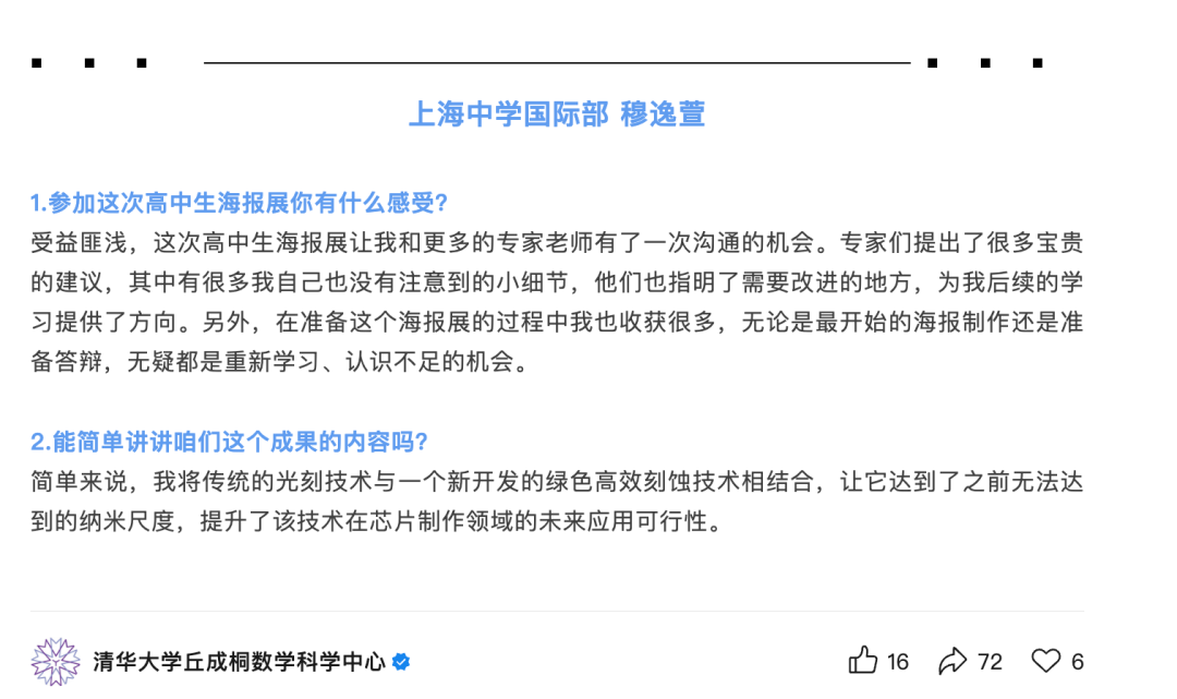 四名同学入选ICBS国际基础科学大会高中生学术成果海报展(物理 计算机方向),其中两人获得优秀海报荣誉,一名学生作为优秀海报获奖者接受采访。