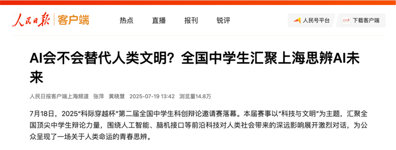 继2024年成功举办首届赛事后,上海中学国际部辩论社再次勇挑重担,牵头组织了第二届“科际穿越杯”中学生辩论邀请赛。本届赛事聚焦人工智能(AI)等科技前沿议题,规模较去年显著扩张,吸引了众多国内顶尖中学辩论队伍踊跃参与,并获得“人民日报”等多家主流媒体关注报道,在中学生辩论领域掀起了一股科技思辨热潮。从线上初赛到线下对决,辩论社成员与志愿者精心筹备、全力保障,为辩手搭建专业交流平台。他们虽未参与正赛角逐,但在7月18日决赛当日,对决科学家、校长以及奥运冠军联队,以“脑机接口技术会/不会拉大人类不平等?”为题,为观众们奉献了一场精彩的表演赛。