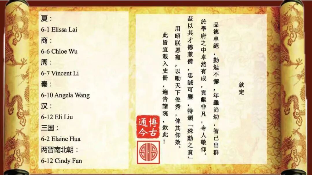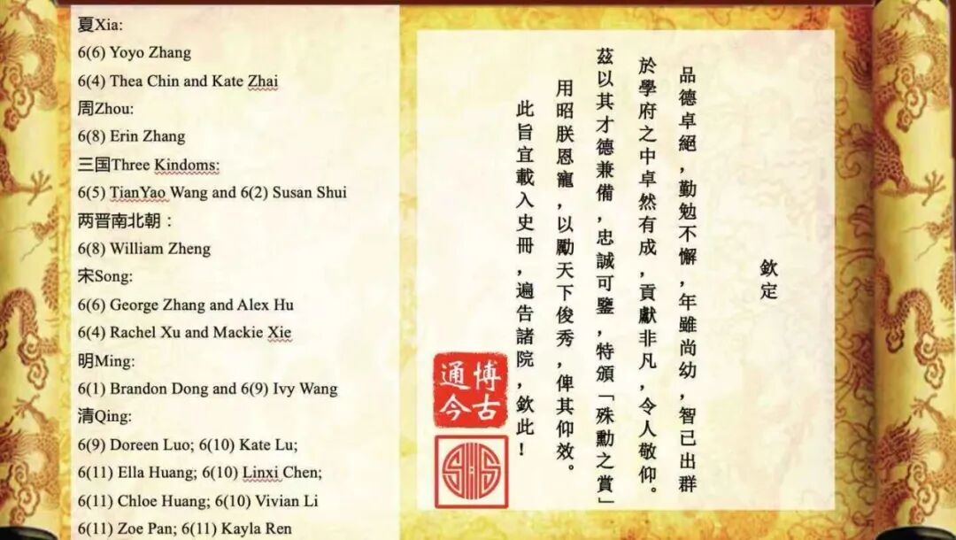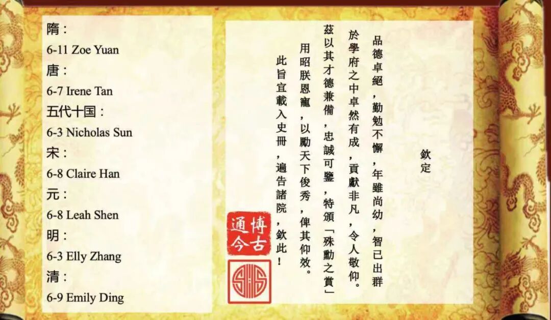 开展当日,国际部初小段校长刘炼老师,国际部初小段副校长刘芳老师,国际部初小段副校长沈天圆老师受邀前来参观。他们认真聆听学生志愿者们对展品的介绍,参与互动游戏,并对同学们在课题作业中展现的历史学科素养与创新精神表示赞赏。最后Mr. Newman为优秀作品颁发了获奖证书,恭喜以下获奖学生。