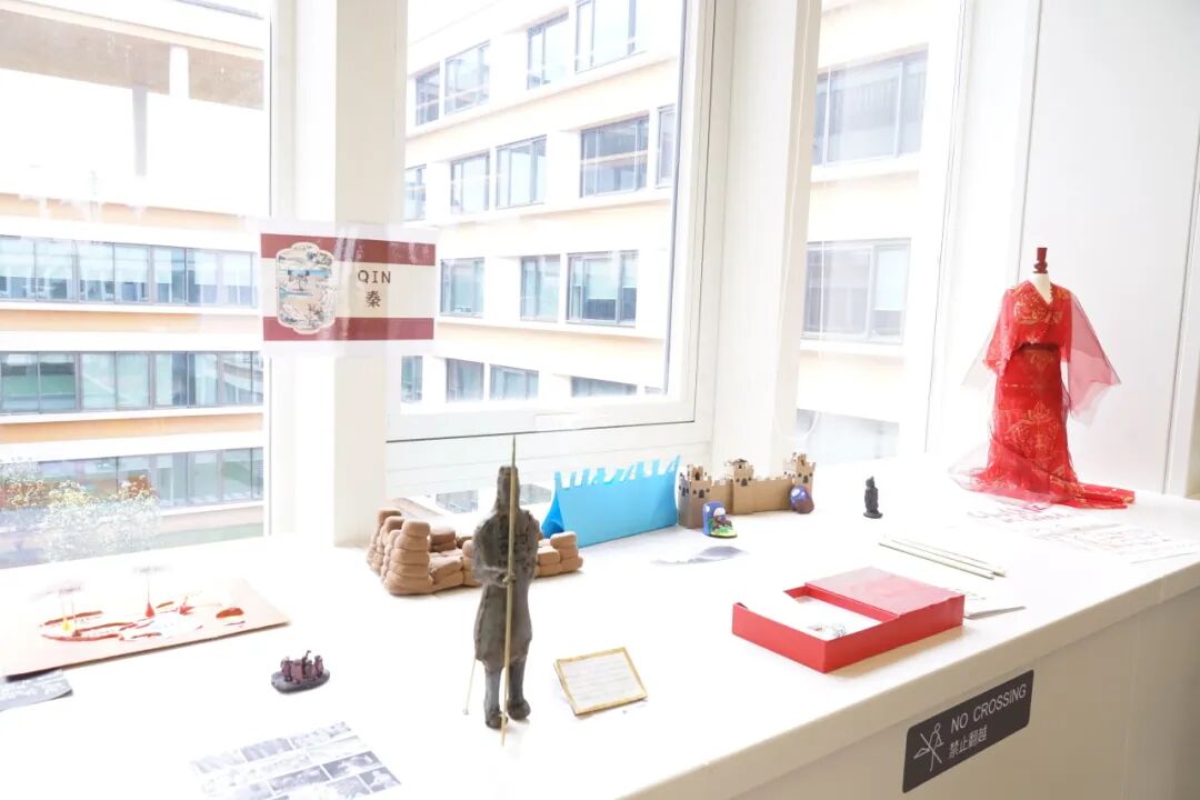 The Class in charge of the Xia Dynasty crafted a massive territorial model, depicting the green land that gave birth to the first civilization in China. On the Shang Dynasty display screen, two eye-catching T-shirts stand out—one adorned with the character "Shang" in oracle bone script, the other featuring swirling cloud patterns commonly found on bronze vessels. The Qin Dynasty section showcases bamboo slips inscribed with Qin laws, posters introducing Qin Shi Huang and Li Si, and a clay model of the Great Wall—all demonstrating the power of the Qin Dynasty.