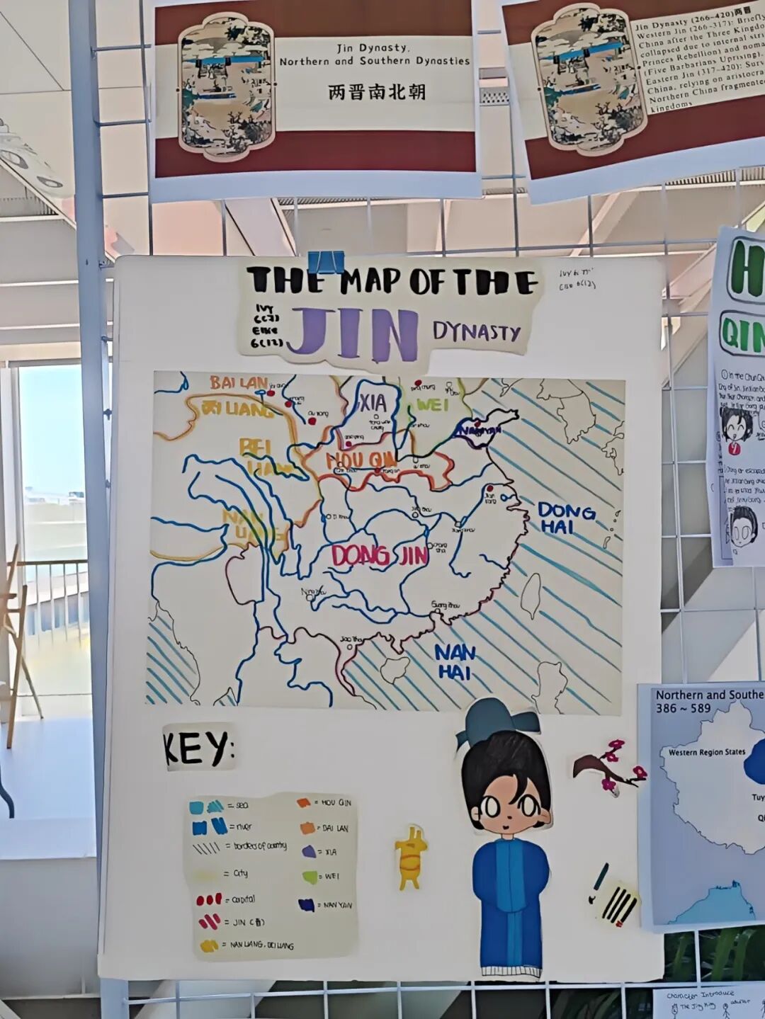 如果你从C楼空中连廊进入,将会看到一个由各班级最佳作品组成的“迷你历史长廊”。三国时期最佳作品是一个战场模型,宏大的场面,众多的人物,以及江面上的点点火花生动再现了火烧赤壁的著名场景。绘制在卷轴上的五代十国的地图徐徐展开,错综复杂、色彩纷繁的地图告诉我们那是一个混乱而动荡的年代。隋朝的长卷轴食谱,沿着丝绸之路走向世界的元代青花瓷……这条精致小巧的历史时间线让参观者可以快速地一览中华文明之精华。