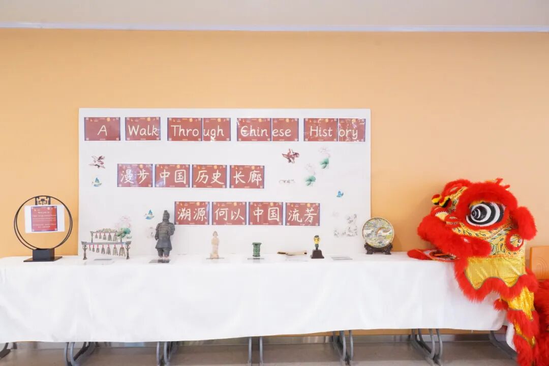 The golden-red lion jumped and tumbled to the thunderous drumbeats, the music stirring the air as the sixth graders' "A Walk Through Chinese History" project exhibition kicked off in a lively atmosphere!