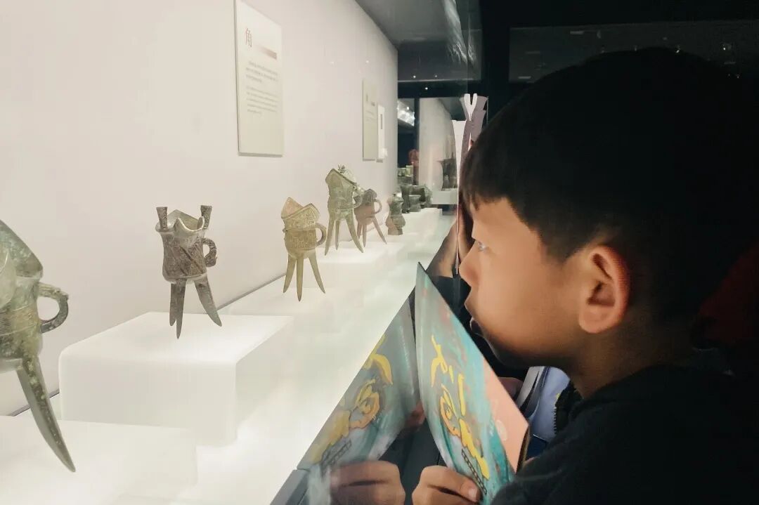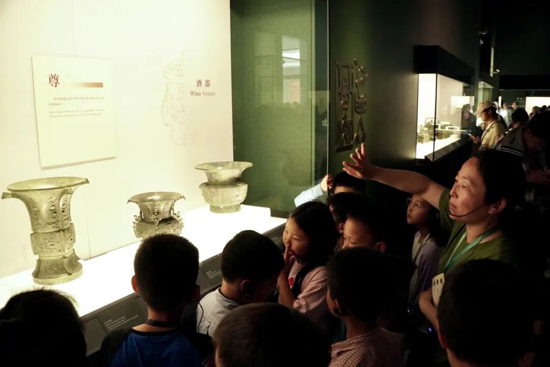活动伊始,讲解员带着同学们来到了青铜酒器展区。“尊”与“爵”,作为古代饮酒文化中的重要角色,率先映入大家的眼帘。