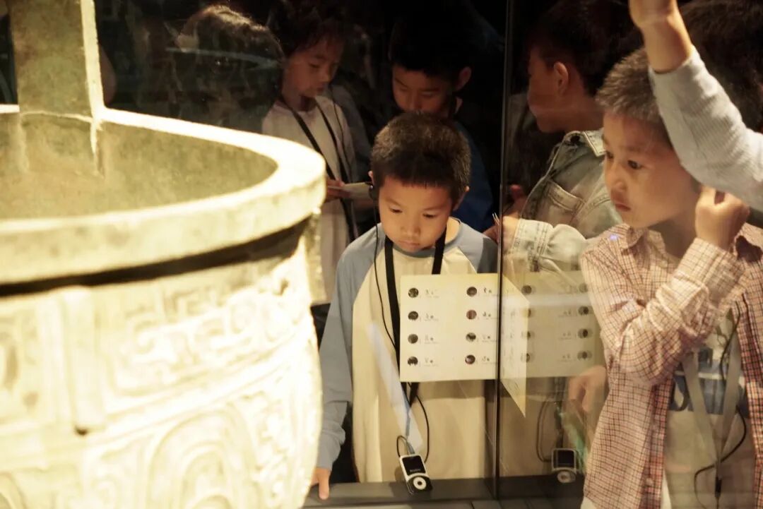 The life of an ancient king encompassed not only work and dining but also a rich array of leisure activities. In the musical instruments exhibit, the ‘Yong’ bell chimes and drums immediately captured the students’ attention. The guide explained that the ‘bianzhong’ (a set of bronze bells) could be summarized by the character "甬," as the bells of varying sizes and thicknesses could produce different musical notes, creating beautiful melodies.