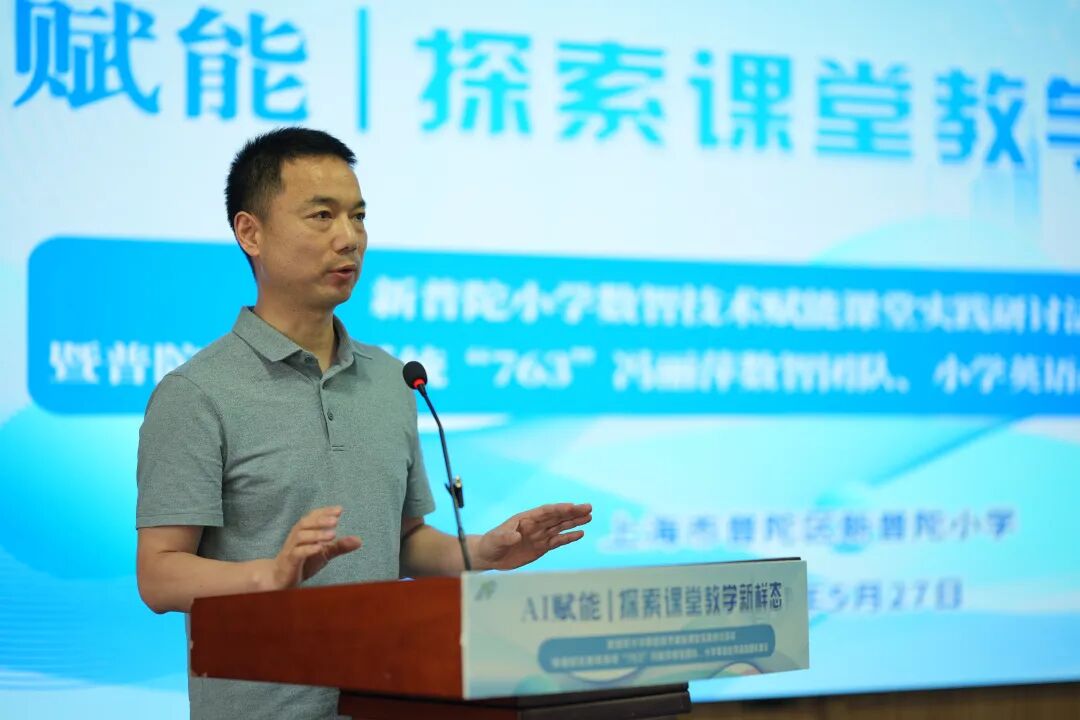 5月27日,《AI 赋能 探索课堂教学新样态》——新普陀小学数智技术赋能课堂实践研讨活动暨普陀区教育系统“763” 冯丽萍数智团队、小学英语赵萍高指团队展示在新普陀小学成功举办。普陀区教育学院副院长葛伟、培训中心主任张杰、普陀区教育学院教育技术研究室主任兼信息科技教研员王世达、普陀区教育学院教研室副主任兼小学英语教研员朱成、普陀区教育学院教育技术研究室副主任李明军、普陀区小学数学教研员胡平等专家领导莅临出席。此外与会的还有普陀区 763 数智团队、小学英语高级指导教师和小学数学高指团队的领衔人和相关成员齐聚一堂,共同见证新普陀在AI技术赋能课堂教学深度融合的精彩瞬间,会议由新普陀小学教学中心主任周燕老师主持,学校党支部书记、校长高静致辞介绍了本次活动的背景,并对各位的到来表示欢迎。