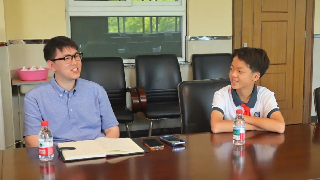座谈会上,领导们亲切询问两位同学的学习进度、课后兴趣活动,还饶有兴致地聊起“校园里最开心的事”。戴凯泽同学讲述了在社区义卖中发生的暖心故事,钱哲宇同学分享在科技社团探索编程的趣事。