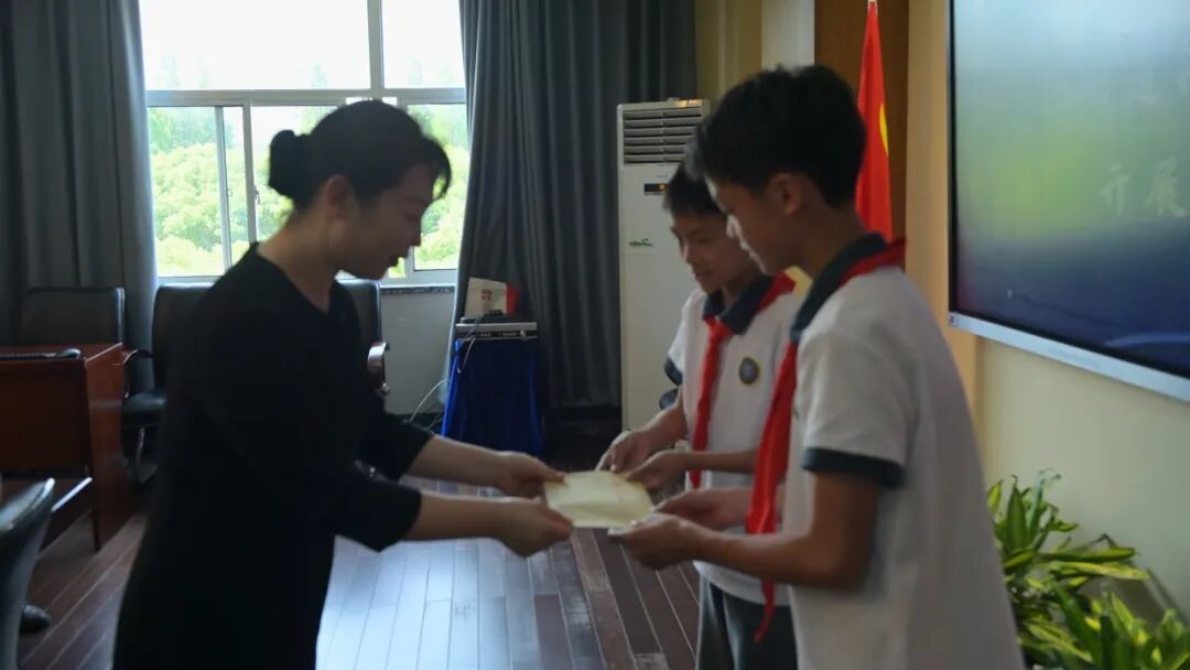 听完同学们的讲述,于茜副书记说“希望你们像小树苗一样,在知识的浇灌下,向着阳光茁壮成长。”随后将江川路街道的“节日慰问礼包”赠予全体文绮队员,两位同学代表全体文绮队员郑重敬礼致谢。