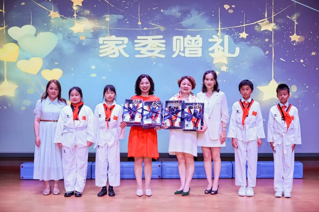 紧接着,史镝炜妈妈和张杨妈妈代表所有家长们表达对学校的感谢,赠送70套跆拳道服,期待一届又一届的上实学子将攀登精神传承下去。