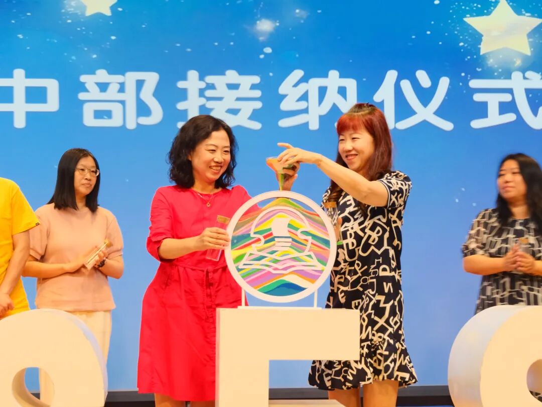 在接纳仪式中,象征知识与勇气的沙砾被封存进琉璃瓶,一道激光划破会场,“开启璀璨新章”的字样随光束流转,将四年的欢笑泪水定格为永恒,将所有人的祝福与期待凝结成新的光芒。新中一年级组长于敏老师也随即上台,为所有即将步入初中校园的学生们提出了新的要求和目标。