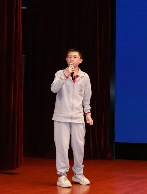 站在舞台大屏幕前,来自国际7B的王崇凯同学紧握话筒,目光如炬追踪着飞驰的赛车。他语速随赛车转速阶梯式攀升,爆破音精准对应刹车点,长句铺陈直道加速的窒息感,短促顿挫则如弯道重刹般刺破空气,让无声的舞台迸发出速度的轰鸣。