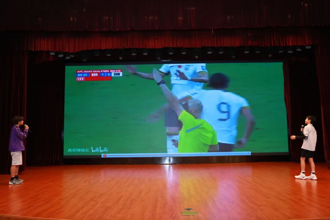 由校领导、体育组老师组成的九人评审团手握四大维度标尺——语言张力、专业知识、时间把控与台风素养,为每位同学的表现进行现场打分。