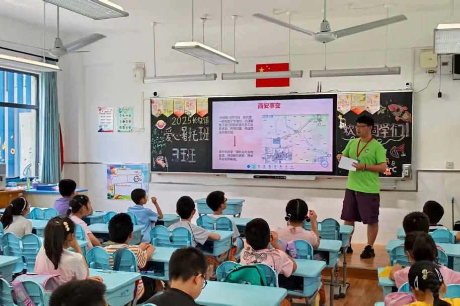 长寿路街道“四史”宣讲团宣讲员沈大雨来到江宁学校的暑托班课堂,为萌娃带来主题为“勿忘国耻,牢记使命”的爱国主义教育。