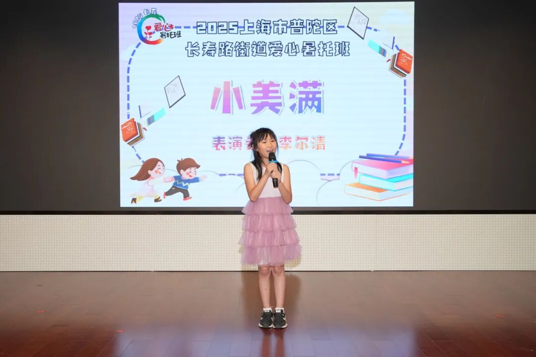 7月25日下午,长寿路街道第一期爱心暑托班结业式在江宁小学小礼堂顺利展开。6位“小小主持人”自信洋溢地亮相舞台,3个班级的萌娃们精心准备了13个丰富多彩的节目。