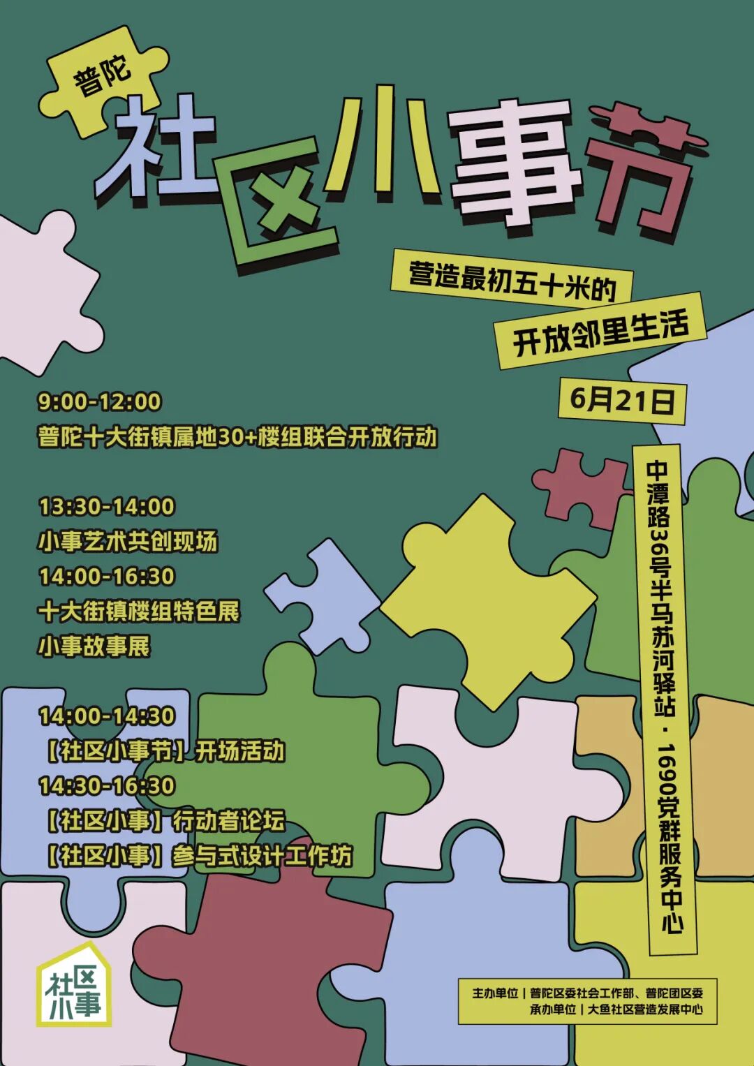 6月21日上午,普陀区各街镇楼组纷纷开展形式多样的开放日活动,一场特别的社区节日在此开启。重回半马苏河驿站·1690党群服务中心,一块块写满名字与涂鸦的社区拼图再次拼接起普陀邻里的温度——这场以“社区小事节”为名的开放日,是一次从街道到楼组的共同交流,也是对两个月来“邻里开放计划”的温暖回响。