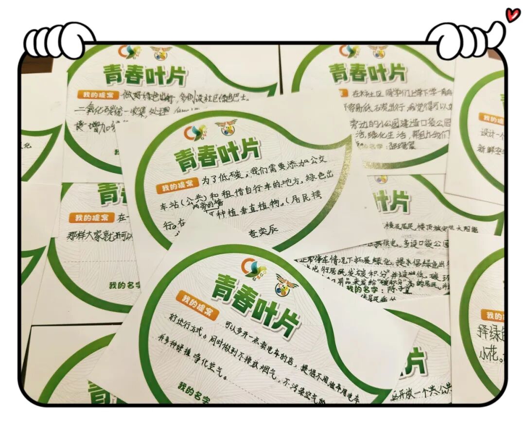 围绕“双碳”社区建设,社区(少年)军校的同学们在“青春叶片”留言纸上写下了对绿色低碳社区建设的创想,也为“一刻钟便民生活圈·上海青少年创新实验室”的“共创社区”板块留下了“绿见未来”的“青春注脚”。