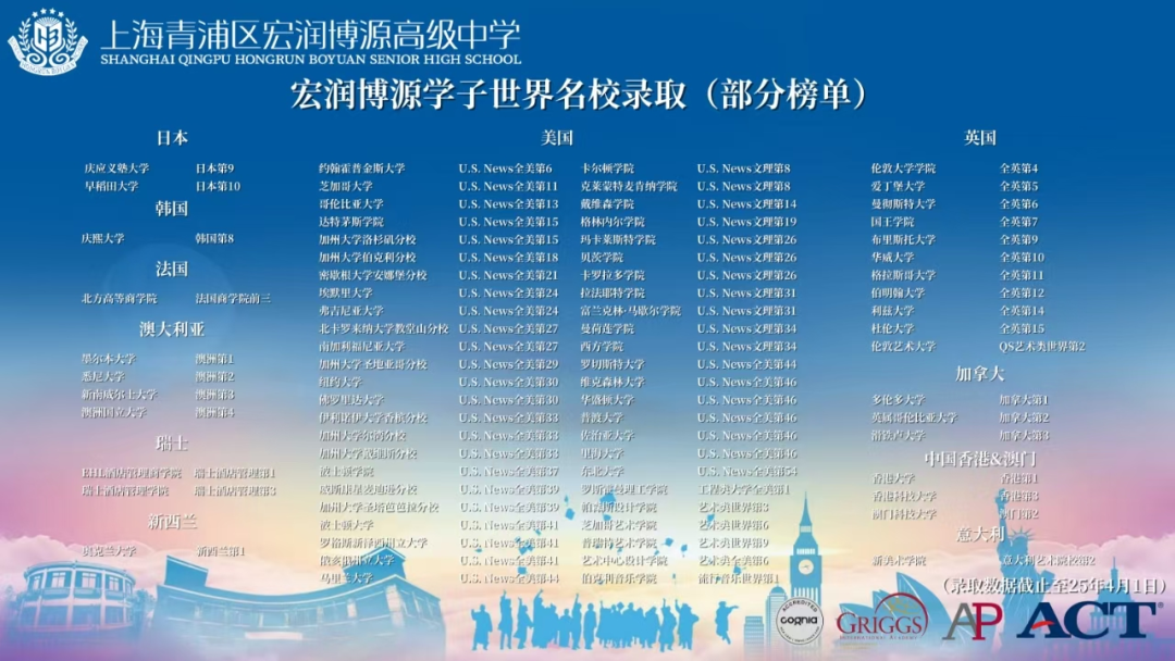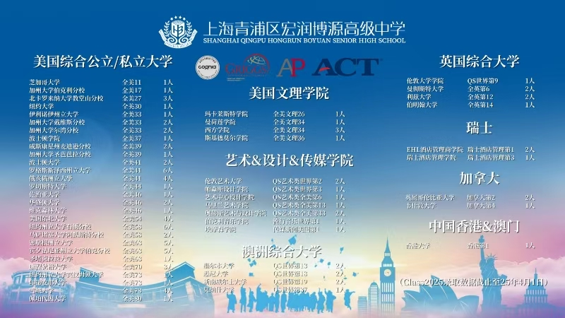 自创校以来,上海宏润博源学校迎来了第7届毕业生,截止到2025年5月宏润学子共收获743封来自美国、英国、加拿大、澳大利亚、新西兰、意大利、韩国、日本、瑞士、中国香港及澳门等国家和地区的世界名校录取通知书!这一数字再次印证了宏润学子的卓越实力与全球视野。