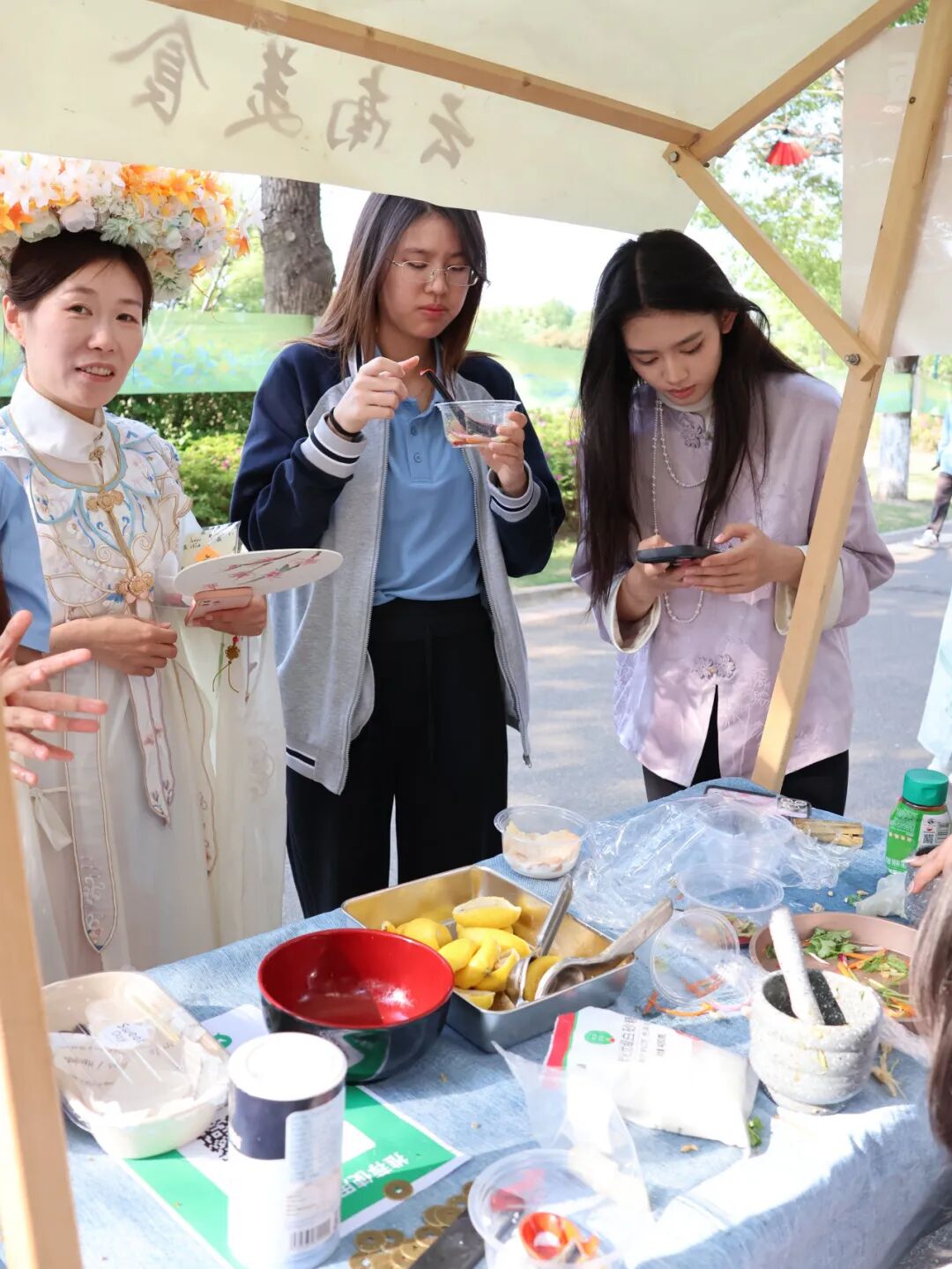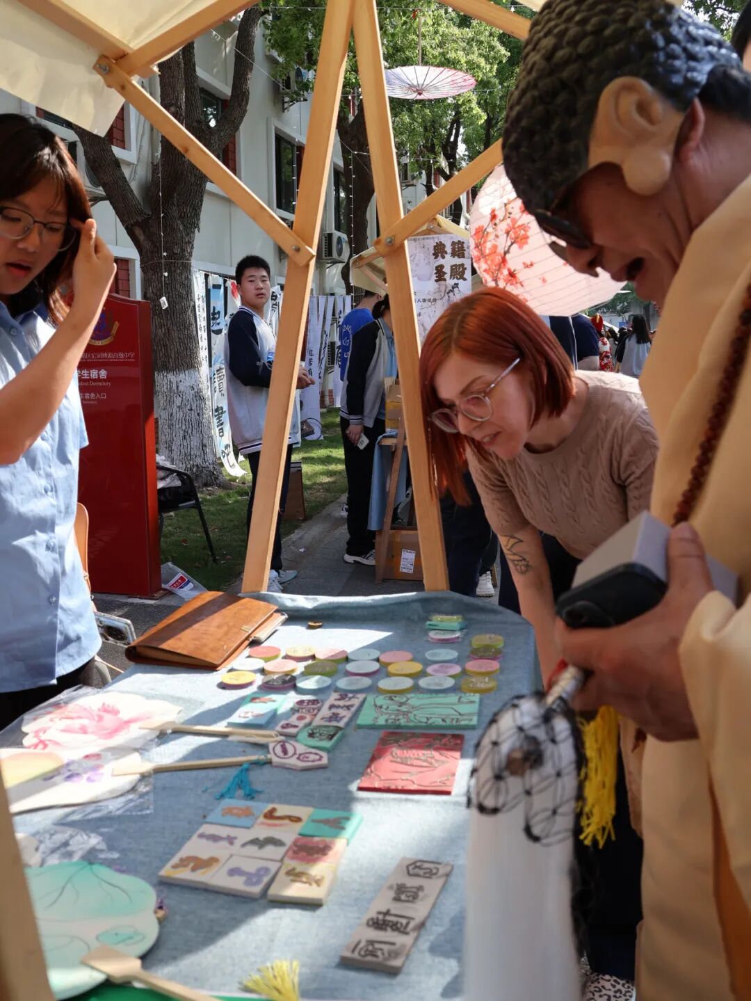 简短而隆重的开场之后,从15:05到16:05,是同学们翘首以盼的自由活动时间。本次文化节精心设置了四大主题板块,分别是“典籍圣殿”、“霓裳羽衣”、“匠造工坊”和“饕餮食肆”,引导同学们从不同维度亲近、体验、感悟博大精深的中华文化。