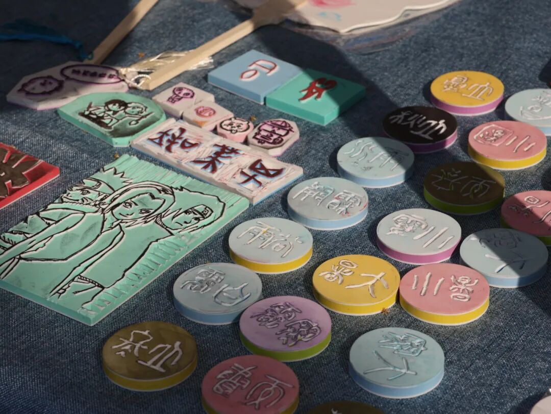 Combining ancient script with modern craft, students carved rubber stamps featuring oracle bone characters, reviving the old writing system in a fun and engaging way.