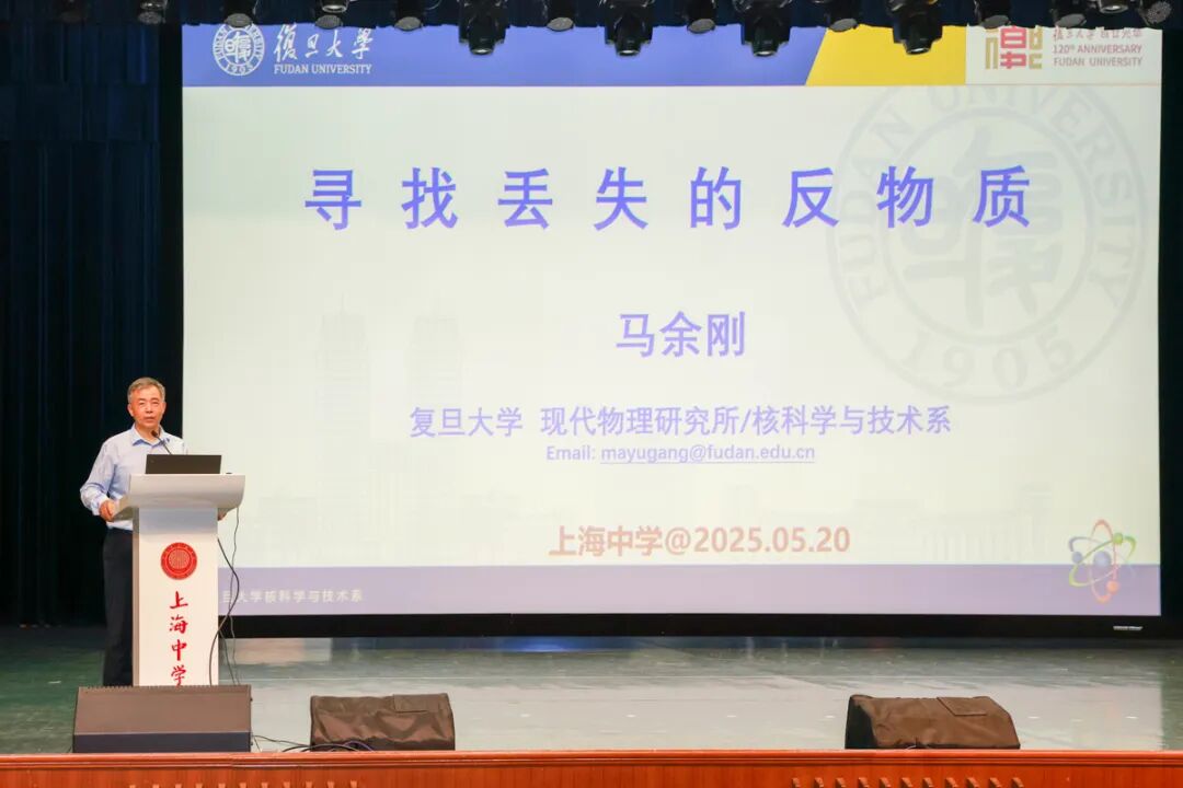 中国科学院院士、复旦大学党委常委、副校长马余刚教授出席活动并于大礼堂作题为《寻找丢失的反物质》的学术报告。马院士长期深耕中高能核物理领域,在反物质研究方面贡献卓著,成果两度入选 “中国科学十大进展”。在报告中,他以《天使与魔鬼》中的经典片段开篇引入物质与反物质的概念,展示了人类认识物质的过程。马院士向同学们介绍了寻找反物质的两种途径以及目前反物质研究的成果与挑战,以详实的实验数据,向同学们展示了cpt对称性等反物质的神奇之处。学生处主任杨炯主持活动现场。
