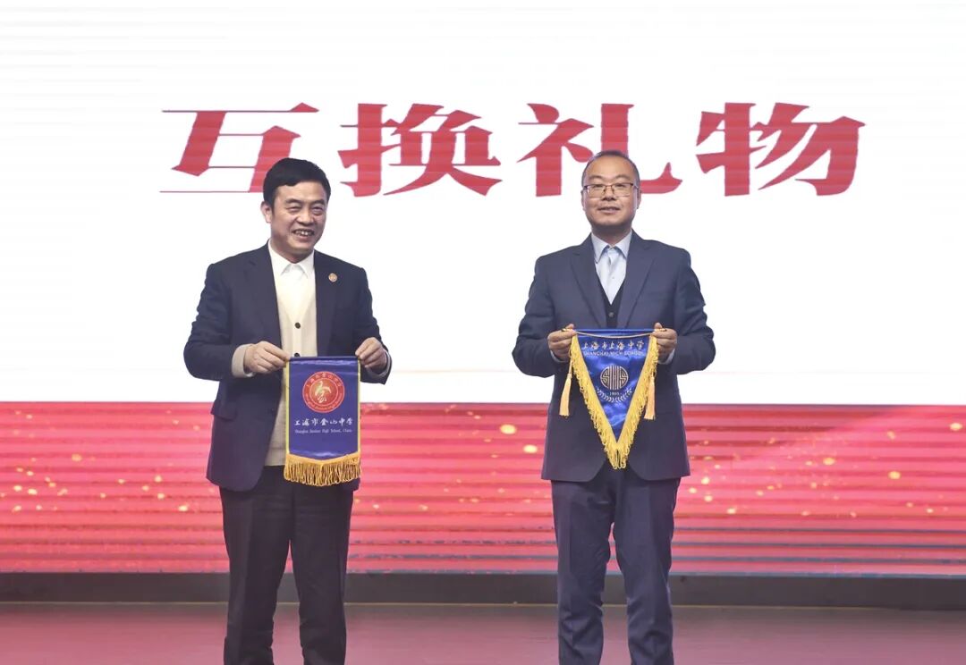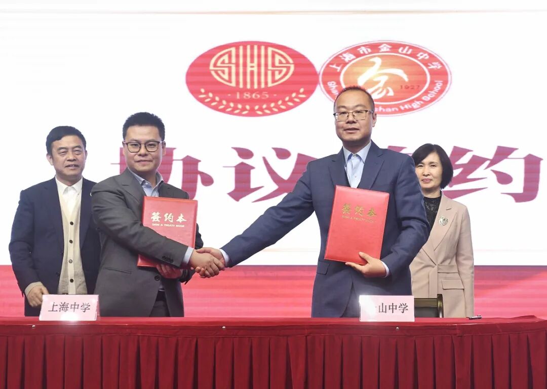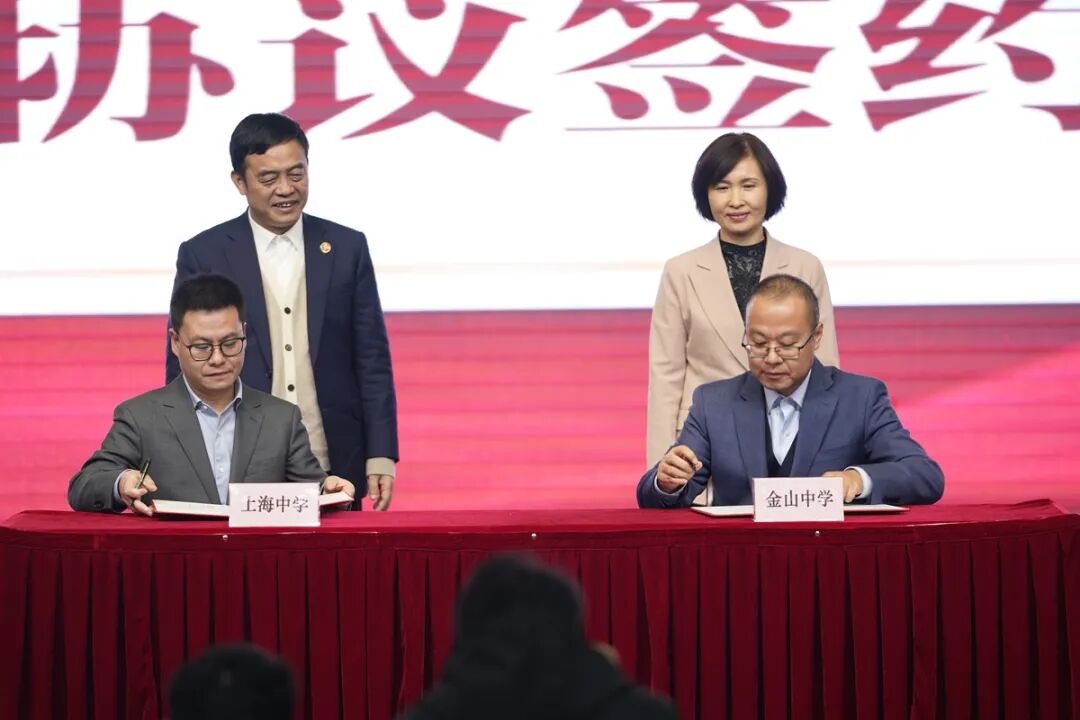 在曹婕和冯志刚的共同见证下,樊新强与金弢签订了上海中学与金山中学友好协议,两校正式结为友好学校。