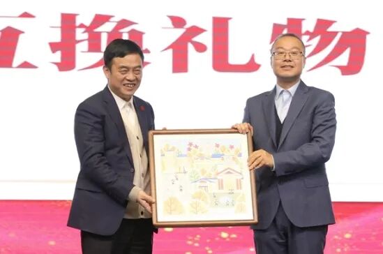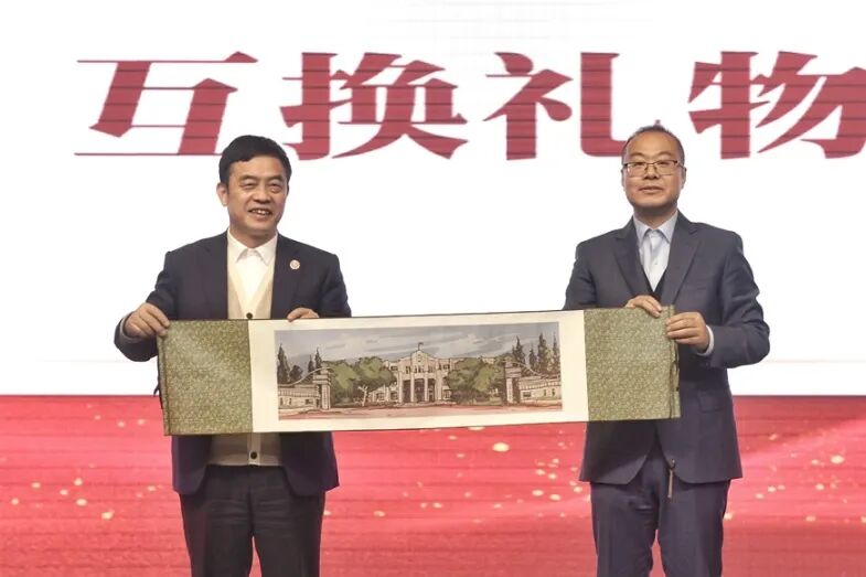 活动中,冯志刚与金弢互换校旗和两校合作的信物。