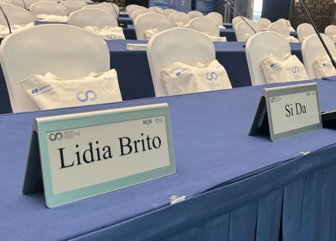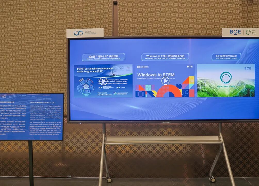 而在“科学十年”分会现场,京东方本着“科技办会”和“绿色办会”原则,通过创新的多触点“万境屏”全面展现了联合国“科学十年”项目介绍、肯尼亚教师培训工作坊的教学成果,以及京东方刚刚发布的可持续发展品牌“ONE”等相关视频,给与会者提供更为直观的感受。不仅如此,此次边会的桌签也替换成了京东方智慧电子桌牌,倡导实现“无纸化”绿色低碳理念。