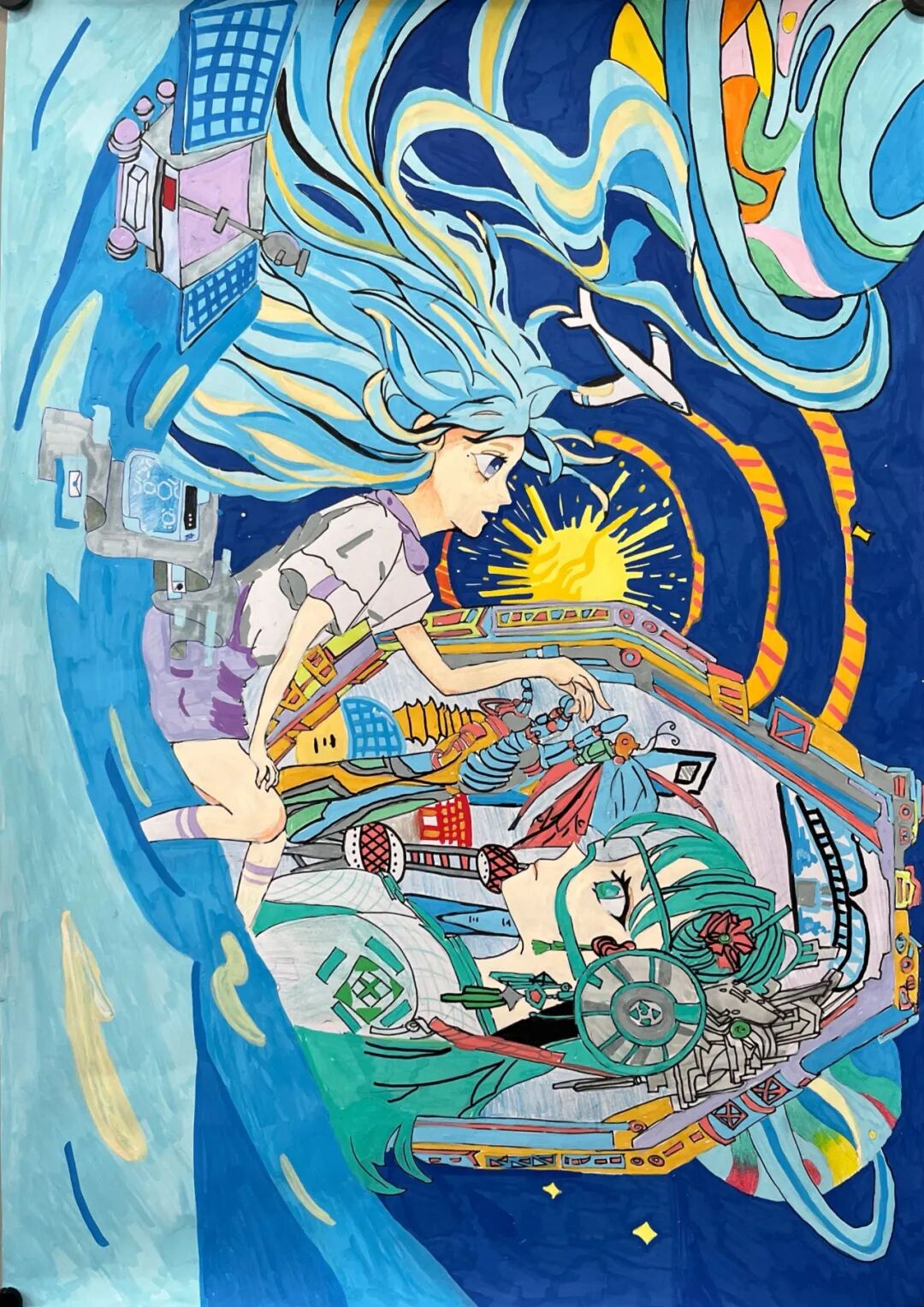 在动漫画项目中,李君奕同学脱颖而出,用极具创意的笔触描绘出奇幻的动漫世界;袁可欣巧妙运用定格动画的创作手法,将经典神话故事中的孙悟空与二郎神激战正酣的精彩瞬间生动地呈现在作品中,赋予传统故事以全新的视觉表达,充分展现了其独特的创意和精湛的技艺;李梓嫣同学的这幅作品以绚丽多姿的色彩、奇幻的未来城市景观以及充满科技感的人物造型,生动展现了海派文化与现代科幻元素的奇妙融合,彰显了作者独特的想象力和艺术创造力。她们的作品犹如一颗颗璀璨的星辰,照亮了动漫画的天空。