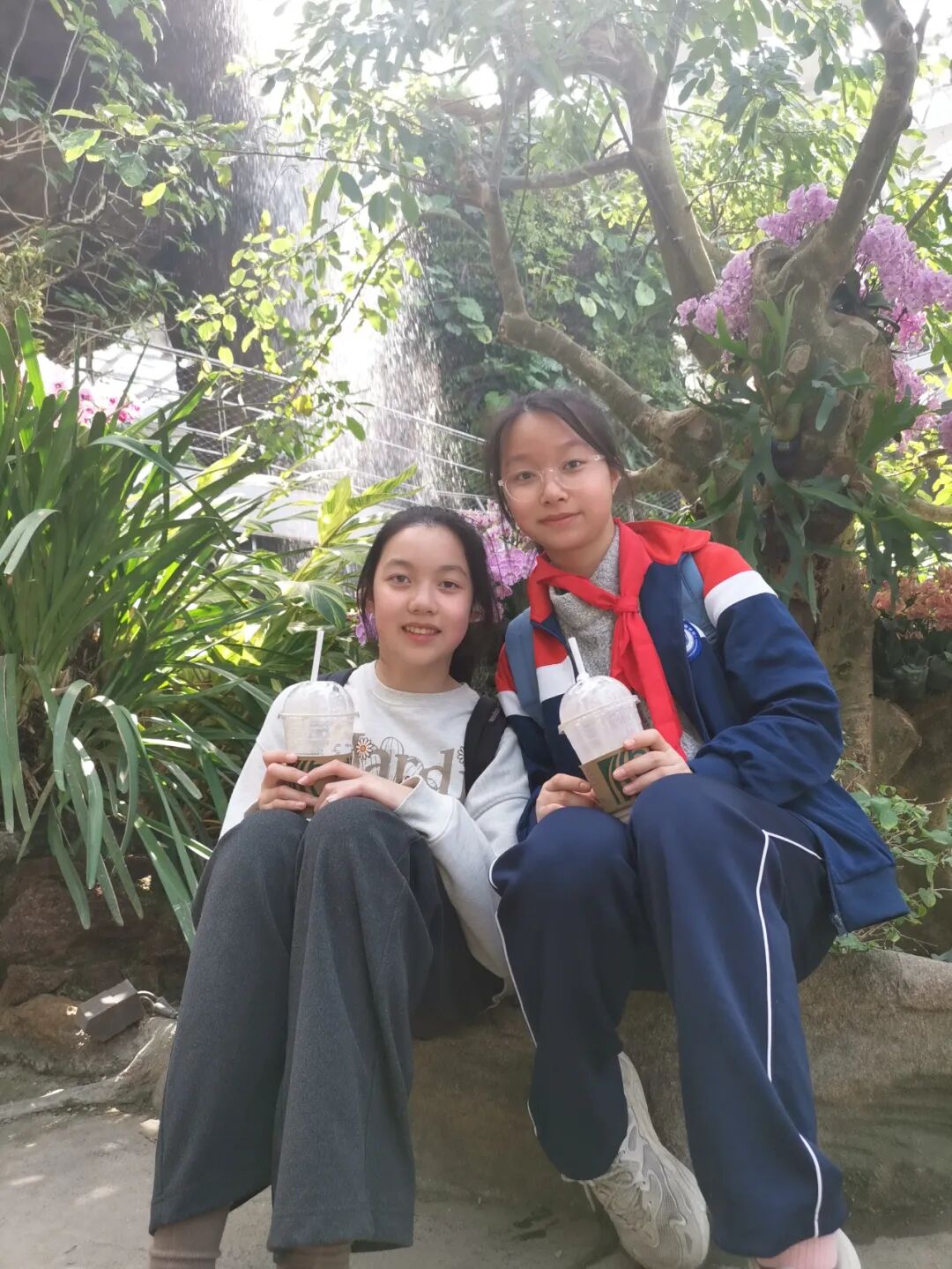 转过竹林幽径,忽闻水声潺潺。“黄果树瀑布”景观前,循环水流自假山飞泻,溅起的水雾在阳光中织出七彩虹桥。同学们撑开透明雨伞聚在瀑前,晶莹水珠顺着伞骨滑落,欢声笑语伴着水声回荡。胆大者伸手触碰飞溅的珠帘,清凉直透指尖;细心人发现水流撞击岩石形成的漩涡,正演绎着微型水循环的韵律。此刻无需多言,春日的灵动已在粼粼波光中悄然浸润心田。