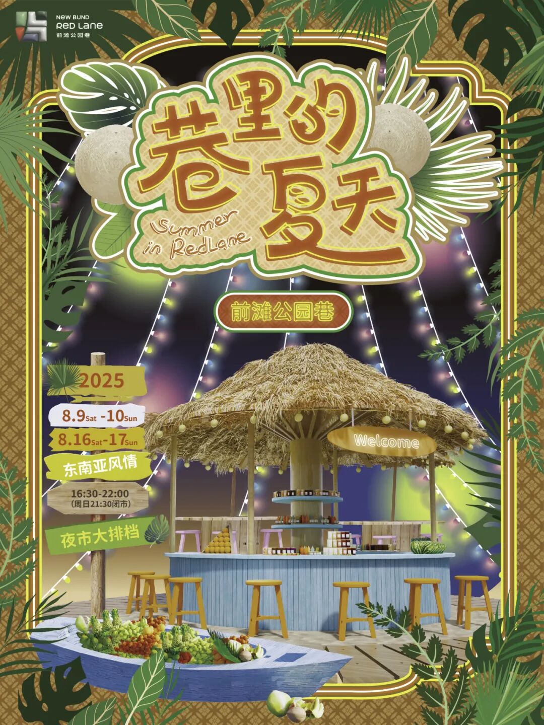 8 月 9 日 - 10 日、16 日 - 17 日,前滩公园巷 “巷里的夏天” 热带夜游秘境开启。40 + 特色美食集结,热带风味与本地滋味碰撞出夏夜烟火,热带风情美食与精彩活动集结。