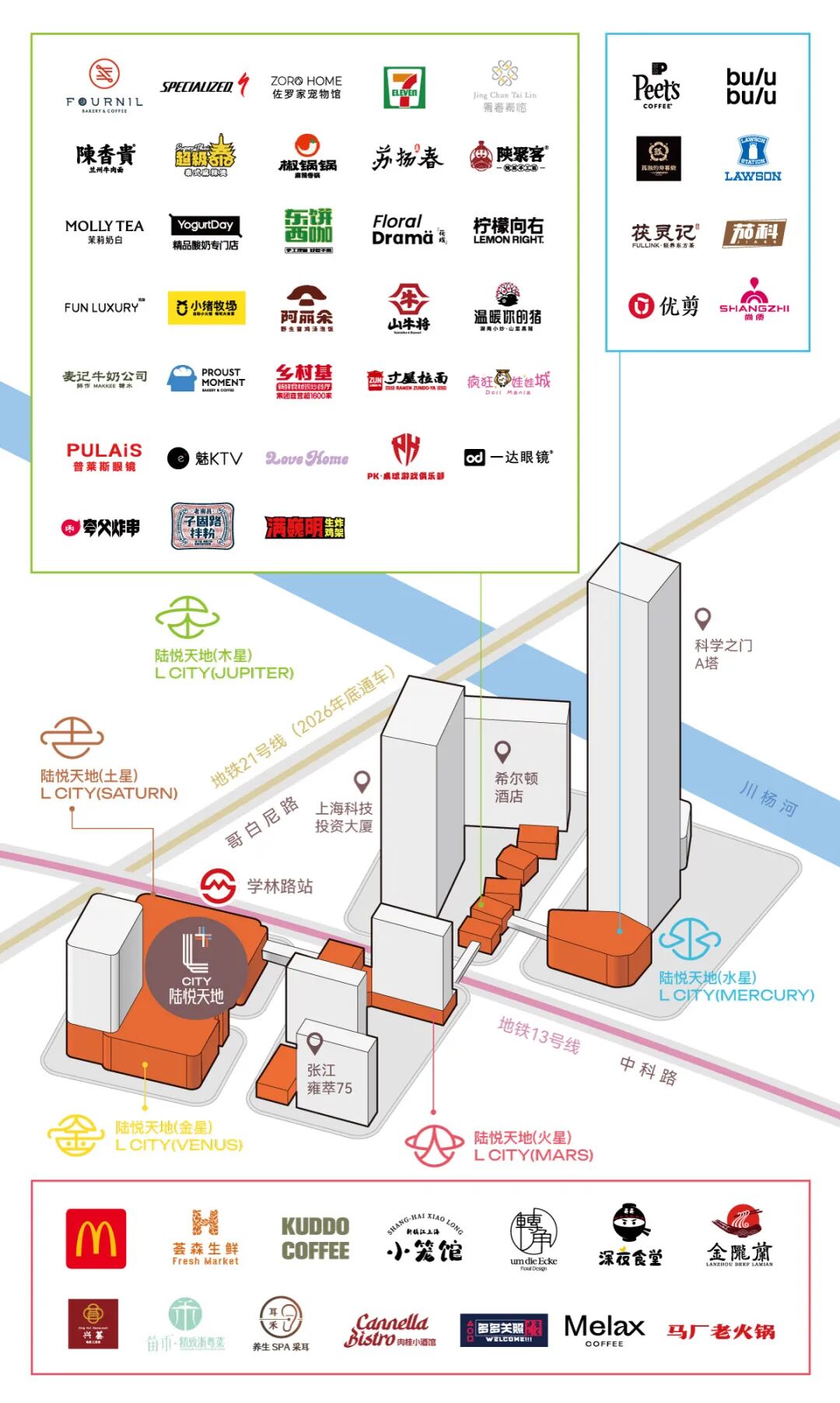 陆悦天地“木星超食空”主题街区位于木星LG层,直通地铁13号线及21号线(在建)学林路站,毗邻张江科学会堂、希尔顿酒店,与办公楼科学之门A塔、上海科技投资大厦无缝连接。目前,陆悦天地(木星)及陆悦天地(水星)区域入驻品牌40余家,其中上海首店及浦东新区首店7家,涵盖人气餐饮、零售、休闲娱乐及生活服务等多元业态。包括知名自行车品牌“闪电SPECIALIZED”、高品质连锁宠物店“佐罗家宠物馆”、中国新锐品牌“花戏FLORAL DRAMA”、吐司届爱马仕“Proust Moment Bakery”、苏扬春、Peet's Coffee、bulubulu活力厨房等品牌,打造健康与活力生活体验。