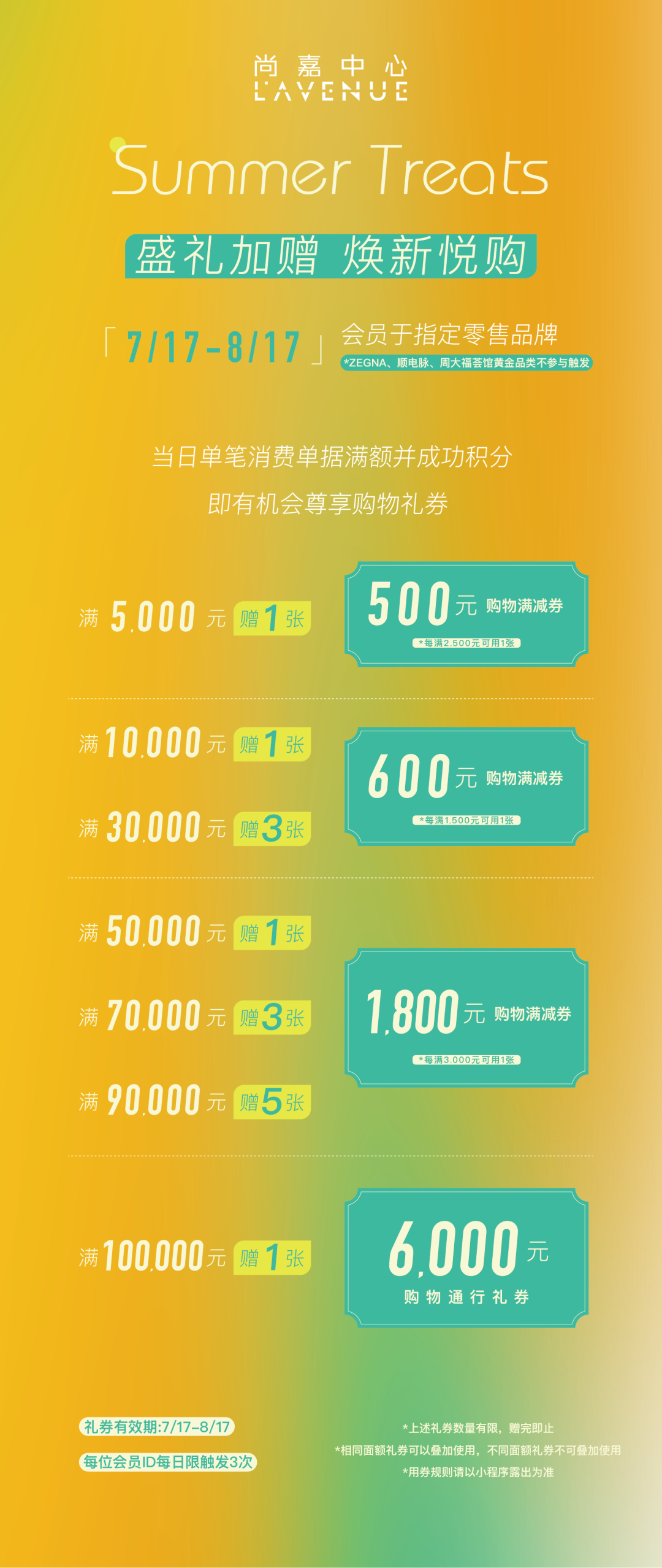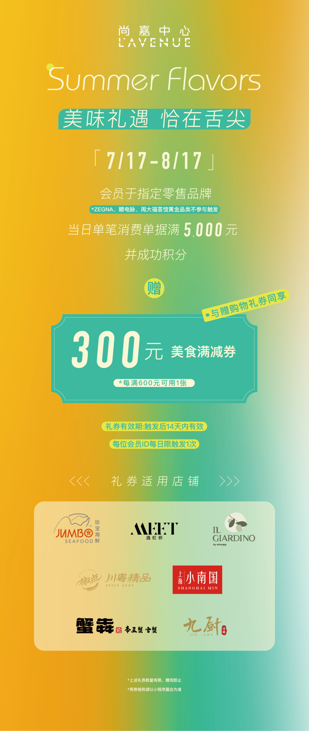 即日起至8月17日,尚嘉中心联合场内品牌打造礼赏盛夏主题活动,会员于零售品牌当日单笔消费满额并积分,即可尊享超值美食礼券及购物礼券。