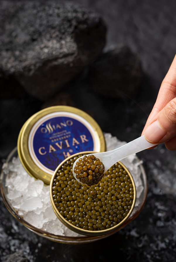 Ossiano Kaluga 10 年鲟鱼子酱源自于中国清澈的千岛湖的俄罗斯鲟鱼。在Ossiano,我们将鱼子酱完美地用冰镇来呈现,并配上母贝勺子,以保持其天然风味。经典的配料包括薄饼、烤面包,以及奶油酱、切碎的煮鸡蛋、洋葱、细香葱和柠檬角等装饰。我们的鱼子酱与香槟、 伏特加或干白葡萄酒搭配效果最佳, 这些饮品都能增强其精致的风味。