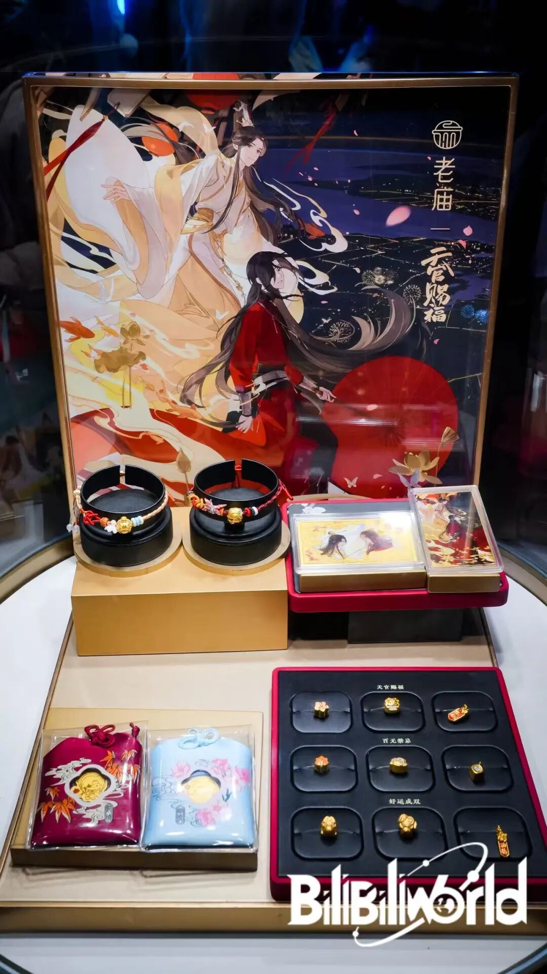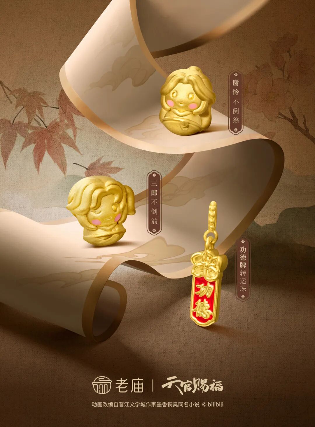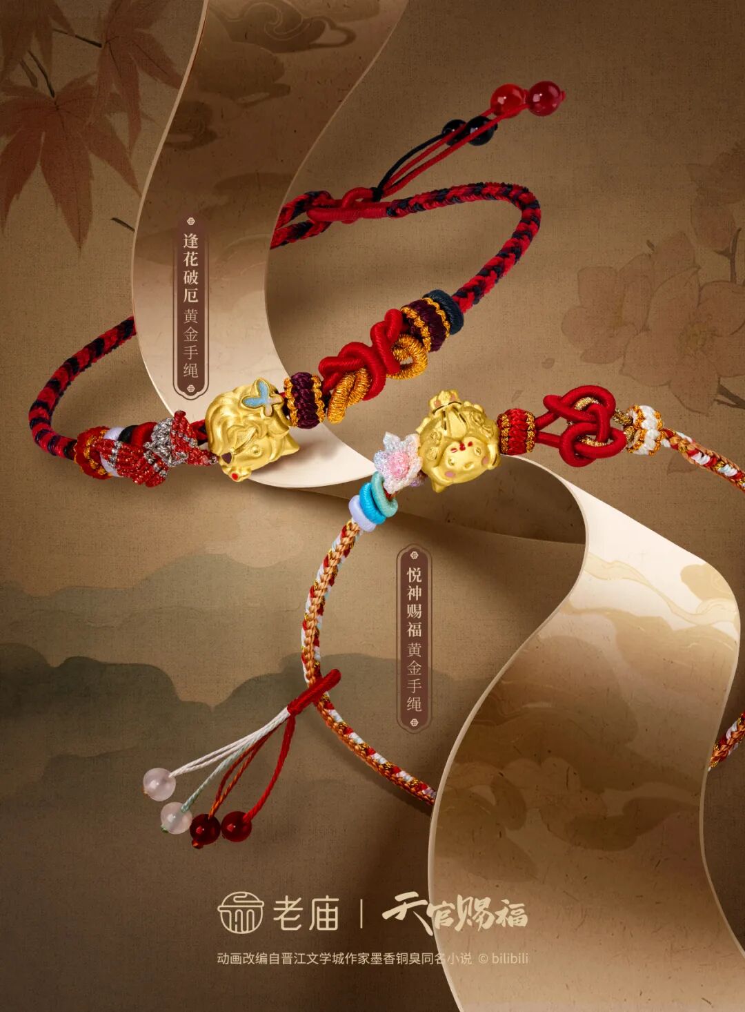 老庙与Bilibili代表性国创动画《天官赐福》深度联动,在景容楼文化旗舰店打造多样化的美陈及互动体验。老庙通过《天官赐福》动画国风美学的氛围感布置,呈现多个IP打卡点位,消费者也可参与互动游戏赢取限定周边礼。活动首日,打卡互动区域持续吸引粉丝驻足,限定周边兑换点排起长龙,趣味的互动机制与精美的联名礼品深受消费者好评。老庙选取国创动画《天官赐福》中主角的经典形象,推出“悦神赐福”“逢花破厄”两款黄金手绳。