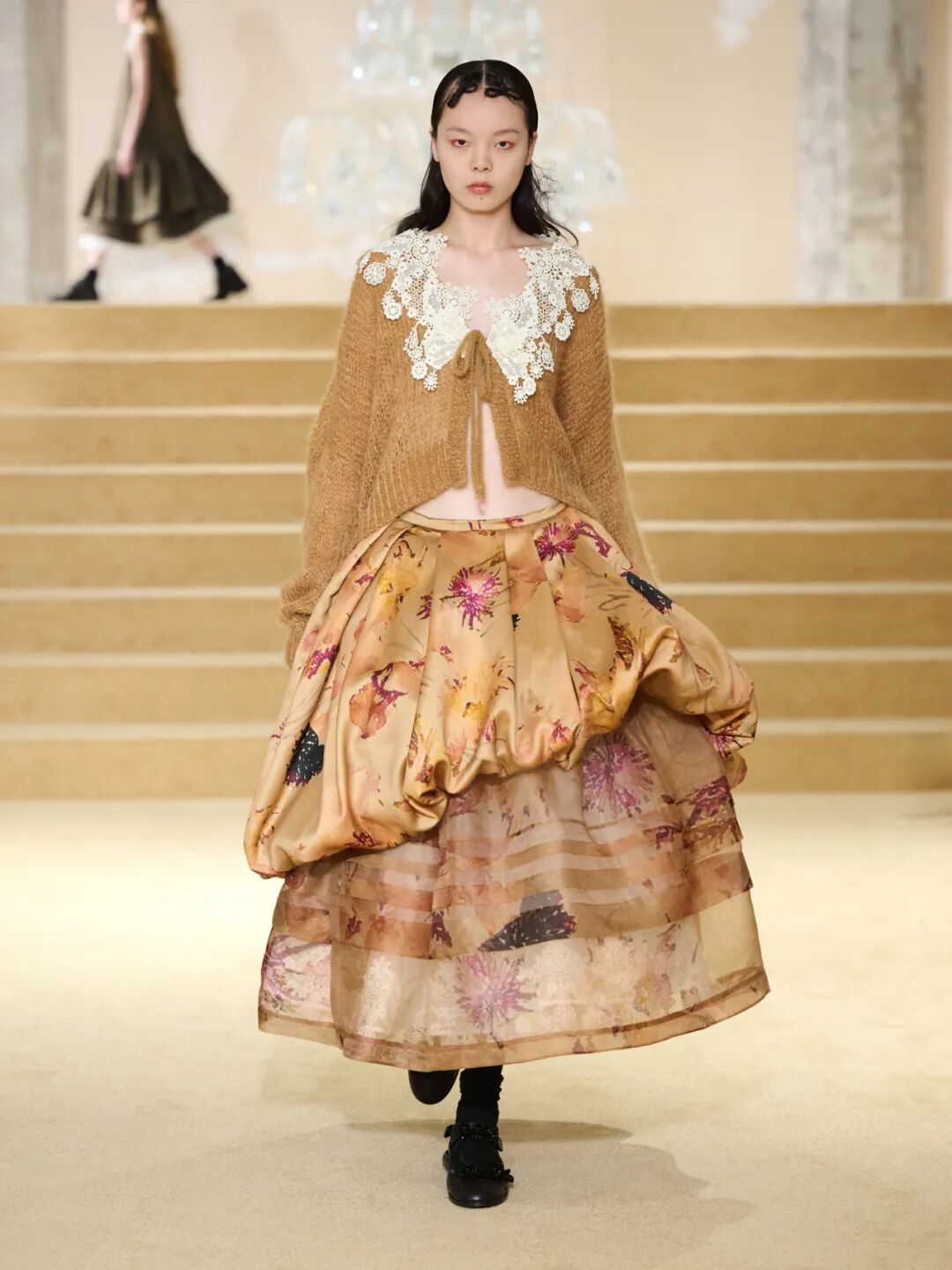 本季系列以动态剪影为核心剪裁理念,运用蕾丝提花勾勒出旋转木马的梦幻轮廓,随着模特的步伐演绎出舞池中跳跃的光斑,展开一场浪漫的视觉叙事。层叠蕾丝成为本季的设计亮点,通过模拟旋转木马的立体结构,复刻游乐园的欢乐与梦幻轨迹。经典蝴蝶结元素被重新演绎,结合柔软织物与透纱蕾丝的质感碰撞,使毛衣与裙装兼具华尔兹裙的梦幻气质,在温暖中定格流动的光轨。
