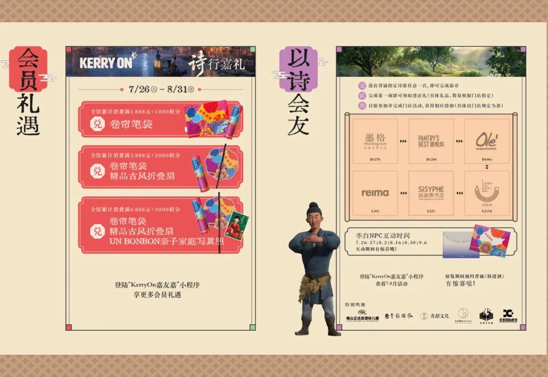 7.26开展日高能剧透:李白NPC吟诗迎客、霓裳舞千幡、民乐合奏掀开盛唐序章。「诗行嘉里」活动期间还能免费参与诗歌工坊、挑战古风投壶,和“李白”玩对诗擂台。参与现场互动或消费更有机会赢取限量古风文件袋、毛笔橡皮、卷帘笔袋等特色文创好礼!遛娃党解锁隐藏彩蛋:集章兑礼、亲手做桃花流水扇、莲蓬灯(详见周末主题活动安排)。这个暑假,相约浦东嘉里城,开启一场穿越千年的诗意之旅!