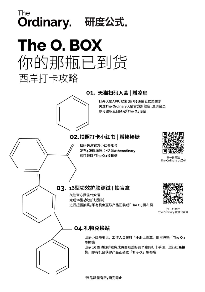 白色远洋集装箱化身The Ordinary限时产品体验站,大家可以在其中体验品牌全线产品,并参与肌肤测试,用站内超过30款产品定制适合自己的护肤流程。快闪活动在视觉设计上延续了品牌标志性的极简、黑白色调实验室风格,在保持严谨度的同时,将透明的护肤知识转化为街头护肤科普实验,不仅强化了品牌“颠覆”、“反传统”的品牌形象,也让功效护肤以轻松有趣的方式走进大众的日常生活。