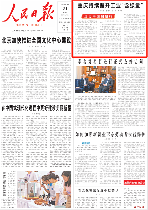 9月21日,人民日报头版《重庆持续提升工业“含绿量”》一文,以中国长安汽车集团两江工厂作为范例之一阐述重庆工业“绿”实践。