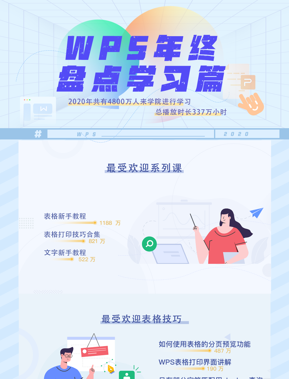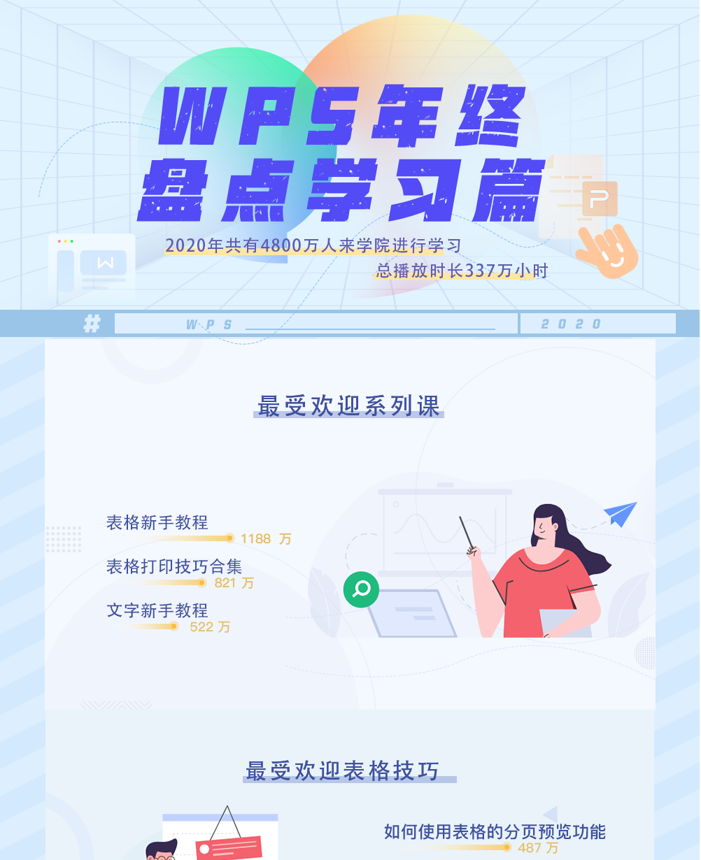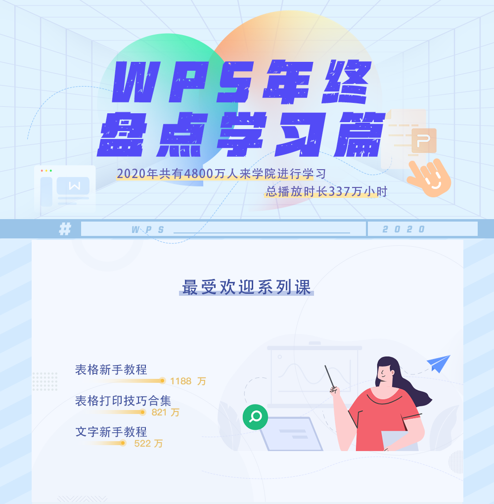 今年,WPS 学院总共发布了 2759 条技巧干货内容,吸引了 4800w+ 人进来学习,年度播放时长 337w 小时。这些内容中,包含了教学视频、微信推文、功能问答等等,未来也会坚持每周持续更新。 针对今年播放次数最高的课程,WPS君也进行了一次详细的汇总: