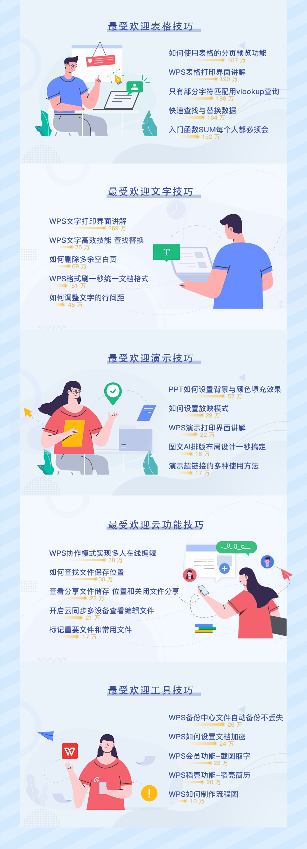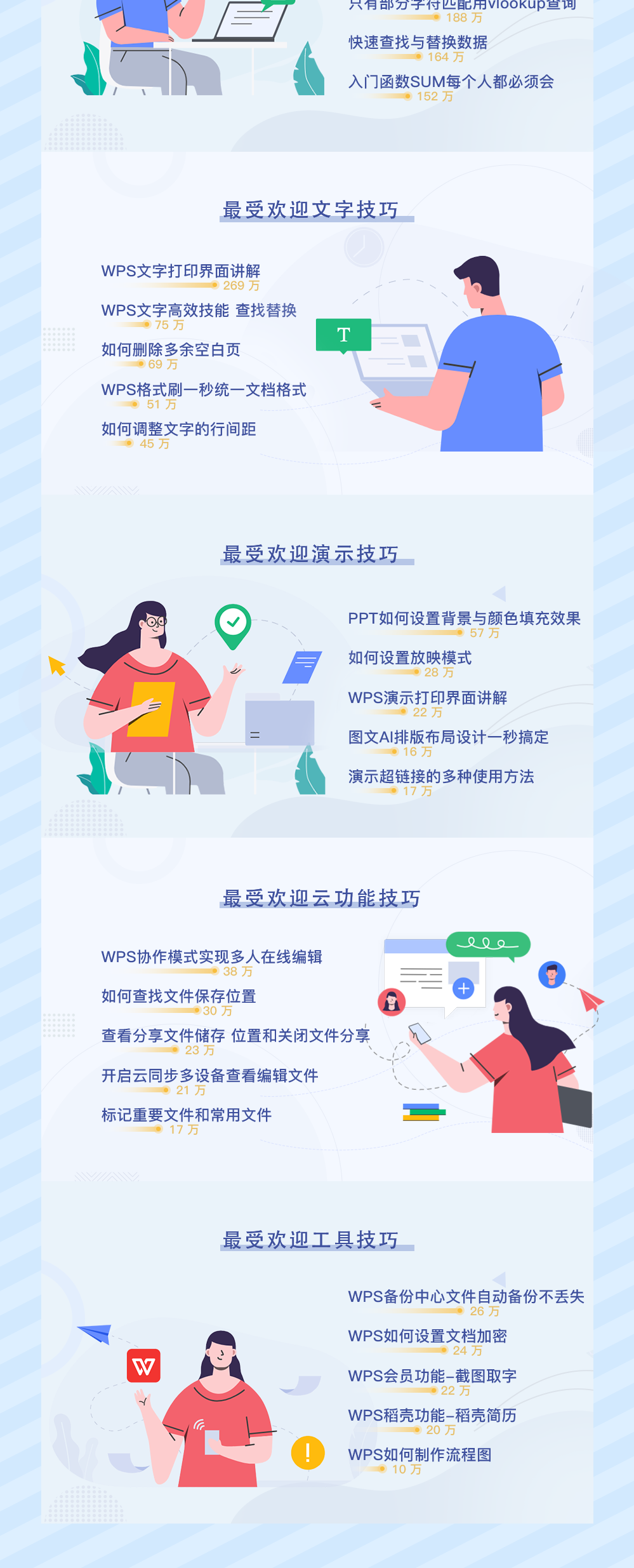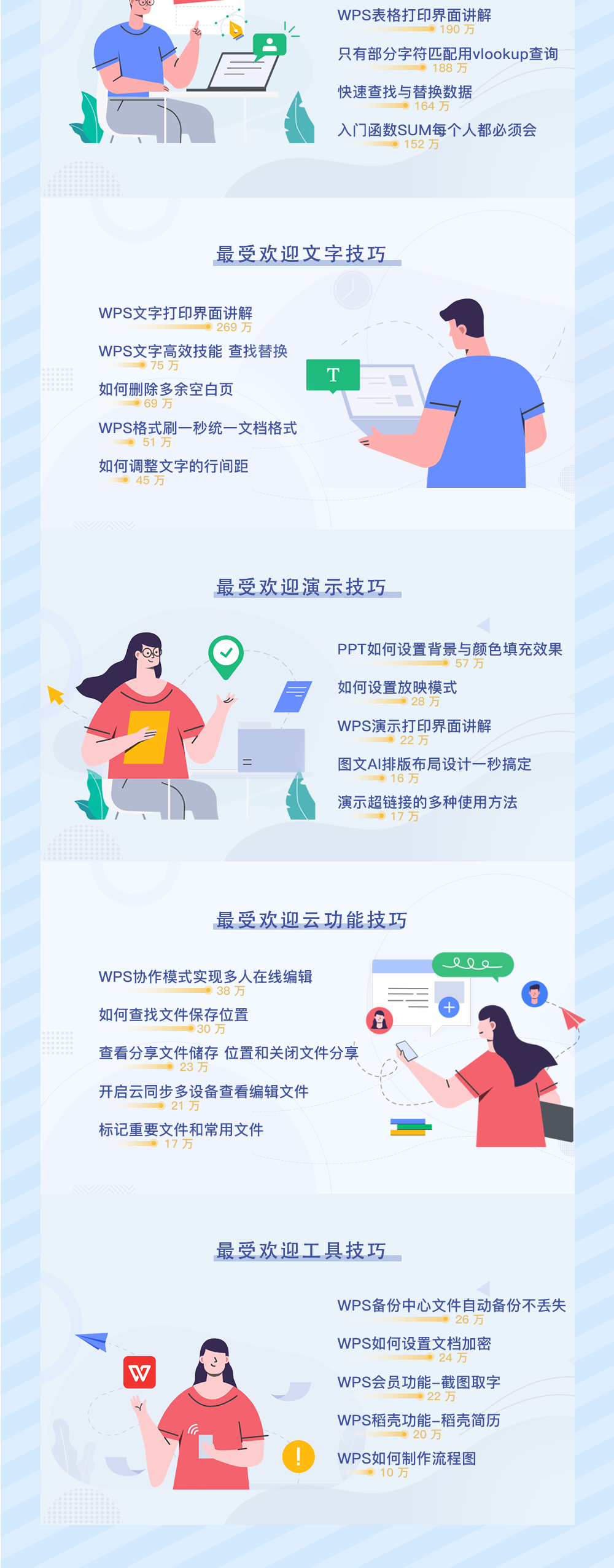 今年,WPS 学院总共发布了 2759 条技巧干货内容,吸引了 4800w+ 人进来学习,年度播放时长 337w 小时。这些内容中,包含了教学视频、微信推文、功能问答等等,未来也会坚持每周持续更新。 针对今年播放次数最高的课程,WPS君也进行了一次详细的汇总:
