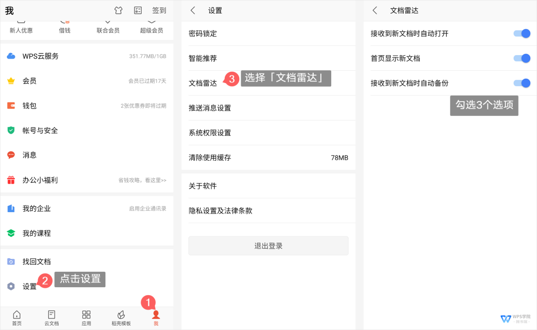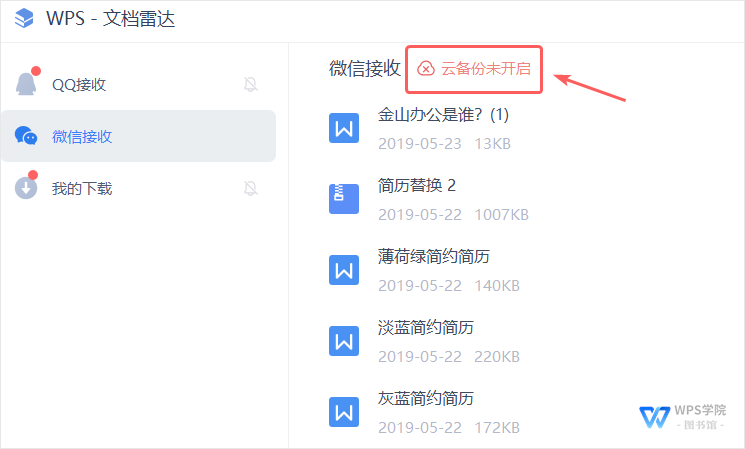 除了用于日常沟通,微信也是大家收发文件的重要渠道。但是,我们总能遇到「文件已过期或被清理」的提示:如果这时候碰巧需要非常重要的文件,点开提示被清理,那感觉得多让人难受呀~不过其实面对这个问题,只要大家学会使用 WPS「文档雷达」功能就行了,从此不用担心文件丢失,非常省事!相比于其他软件需要每次手动备份,WPS「文档雷达」功能开启后,便可实现自动实时备份。什么意思呢?简单点说,就如同雷达的名字一样,你在微信打开的文件,「文档雷达」会快速定位到系统缓存的目录,并将它们保存到云文档。如此一来,微信提示文件过期或清理也不怕,在 WPS 云文档就能找到。自己的文件有效期自己做主,别人都无法决定!除了微信上的文件,WPS「文档雷达」功能还可以实时备份在 QQ、浏览器下载的文件,帮你减少日常文件丢失、过期或不宜寻找且难管理的风险。WPS「文档雷达」功能目前支持 Windows、安卓系统,使用的方法十分简单:① 打开 WPS,双击桌面右小角的蓝色图标「WPS办公助手」,点击「微信文件」:③ 开启后,在该设备接收的微信文档便会实时备份,你可以在 WPS 云文档的文件夹「我的设备」中找到设备名称,便可查看文档。点击底部的「我—设置」,选择「文档雷达」,在新界面中勾选 3 个选项即可。备份文档的查看路径,与前面提到的 WPS 2019(Windows 版)一致。除了「文档雷达」功能外,WPS 还有很多功能可以帮你告别文件丢失。比如说: