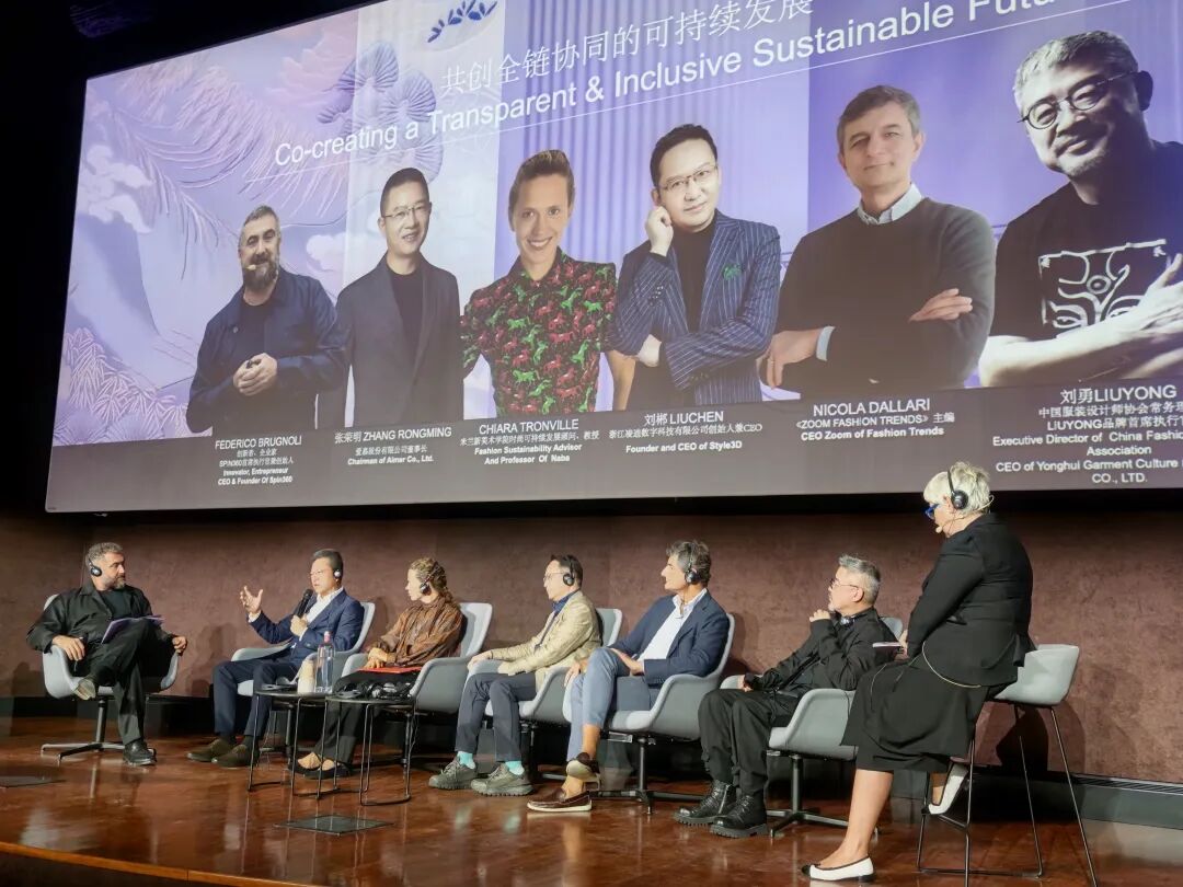 圆桌对话“共创全链协同的可持续发展”,指明了时尚产业未来的发展方向,强调产业链的每一个环节是“命运共同体”,需要集结力量、分享智慧、共同探索。对话由SPIN360公司主席FEDERICO BRUGNOLI先生主持,共同交流的还有浙江凌迪数字科技有限公司创始人兼CEO刘郴先生、LIUYONG品牌首席执行官刘勇先生、《ZOOM FASHION TRENDS》主编NICOLA DALLARI先生、米兰新美术学院教授CHIARA TRONVILLE女士。