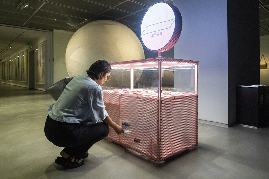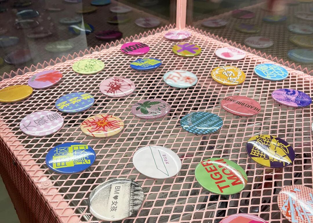 在此次展览中,林天苗再次选择以“玩”的方式对待这些自己也曾困惑地对之施以审视的话语系统。这些她收集了多年的词汇——从“大飒蜜”“白领丽人”这类充满时代印记的俚语俗称,到“space queen”等受外来文化影响的新词——被设计成了上百种徽章,它们将在展览现场通过一辆特制的小车售卖。这个极具象征意义的举动将沉重、复杂、充满争议的社会议题以一种可消费的方式化解了,也在某种意义上把定义“你是谁”的权力,在短暂的互动中真正交还给了独立的个体。带着自嘲、讽刺或轻描淡写的获得感,人们可以选择一个或多个徽章来代表自己。这或许是林天苗为这个困扰她多年的问题找到的最好出口:邀请所有人一起“玩”。