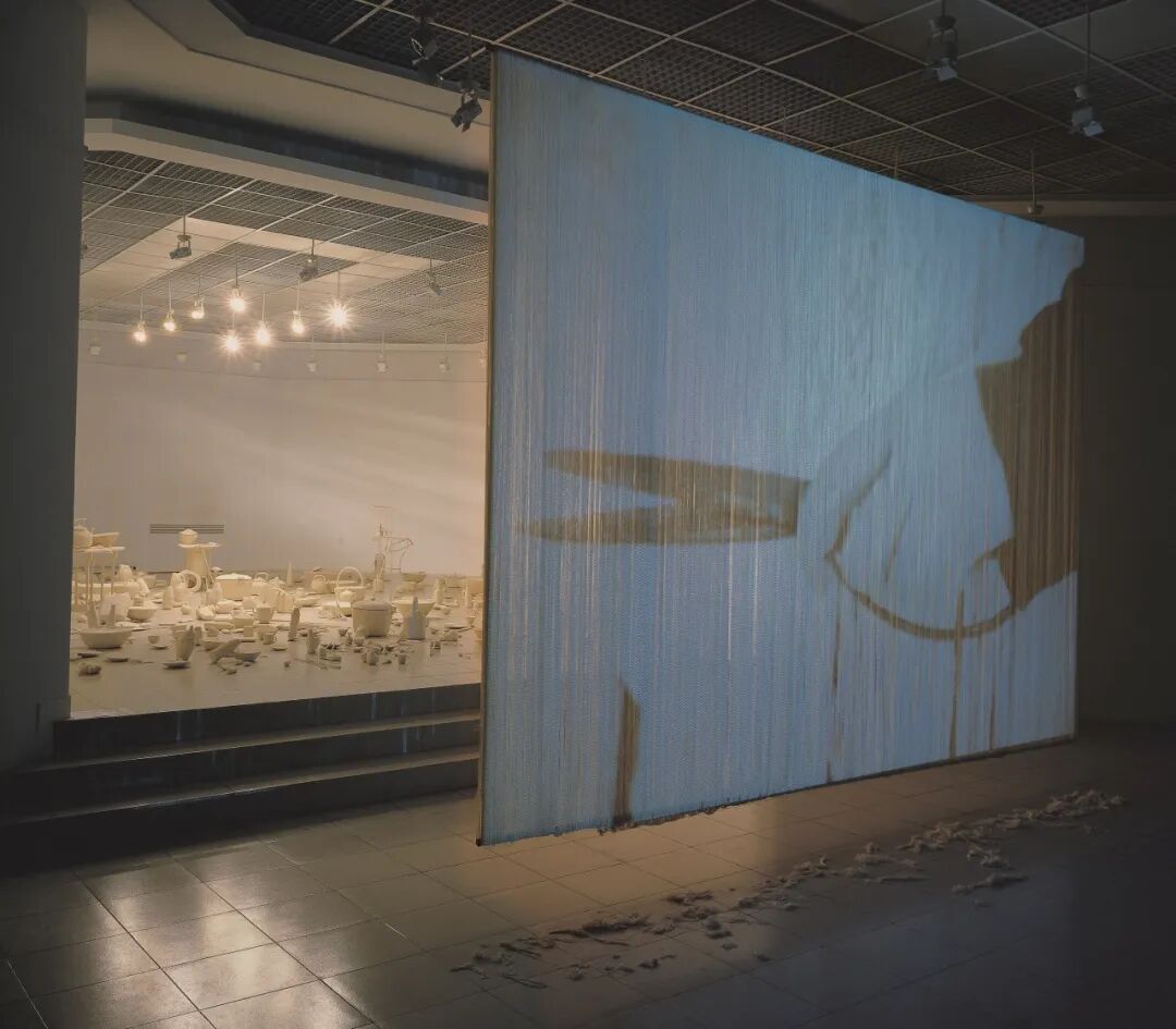 林天苗,《缠了,再剪开》,1997年,棉线、家居物件及录像装置,尺寸可变。香港艺术馆藏品。艺术家供图。