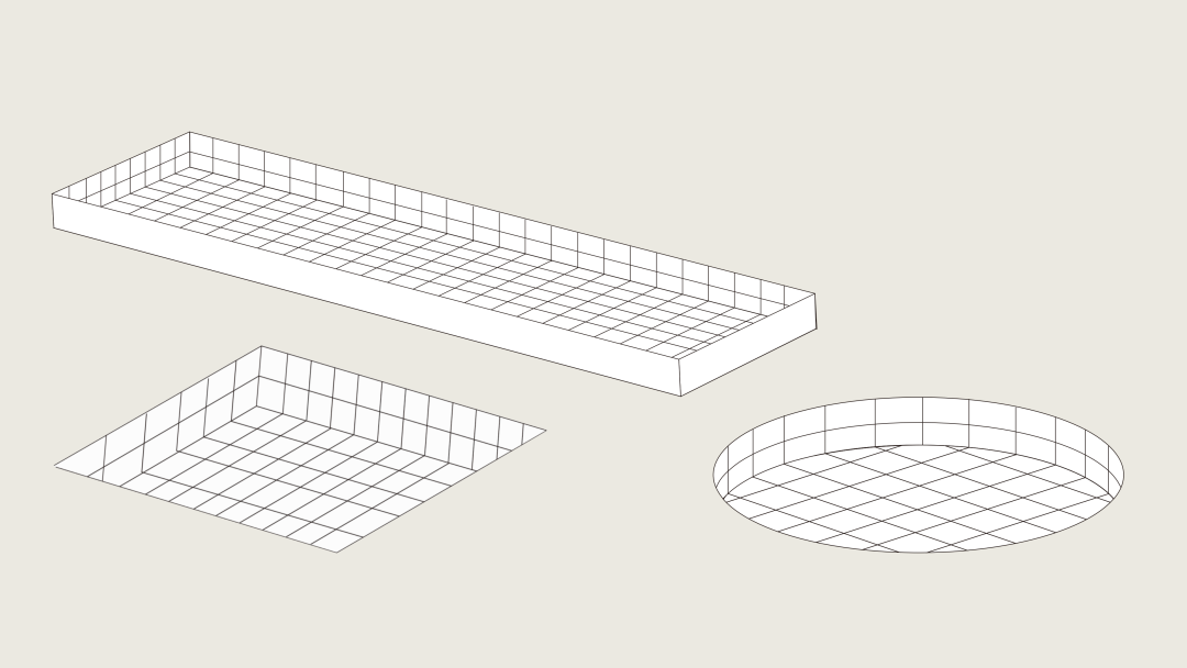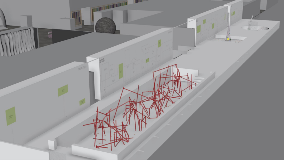 根据上海当代艺术博物馆在SPA空间特殊的⻓形走廊,以及其中的圆坑、方坑、⻓方坑三个下沉空间和走廊墙面,林天苗工作室通过建模进行种种创作试验。图片由林天苗工作室提供。