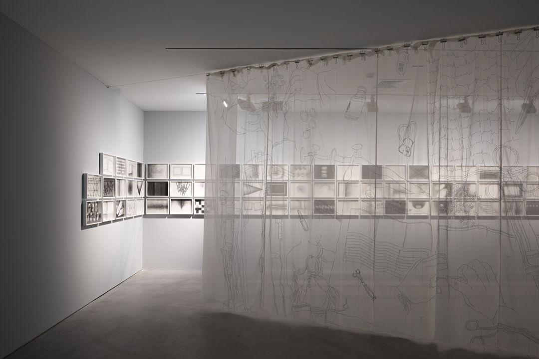 “身体的触感对我特别重要,”林天苗不止一次强调,“必须亲身经历过,身体颤栗过,才可能体会到真实。”林天苗的创作履历本身就是这一观念的详尽注脚,其诸多代表作都与她生命中的关键节点紧密相连——《缠了,再剪开》(1997)是她在生育之后通过漫长的缠绕过程走出产后抑郁的一次自我疗愈;《一滴一点》(2022)则是在化疗期间,将滴入身体的药液观想为纸上的墨点,摹画出仿佛被捏瘪了的、包装着药丸的铝箔,以此抵消身体和心理的荒芜与绝望;而《i情》(2024—2025)中彩色胶带纸上一字一句的诘问,更是林天苗在术后漫长的恢复期中进行的一次“没有目标的对抗”和自我对话。艺术对她而言,既不是一个被动的开关,也不仅仅是穿越困境的舟楫,而是一种与生命体验深度捆绑、共生共存的本能反应。