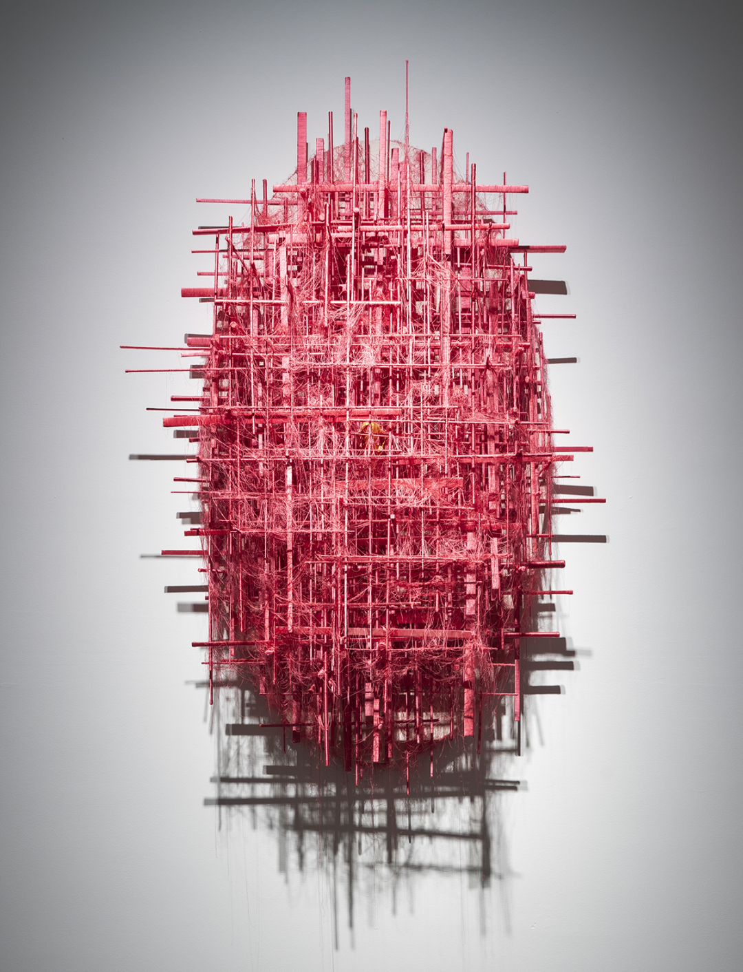 如社会学家C. Wright Mills所说,“不掌握个人生活史与社会历史二者相互作用的机制,就无法理解个人生活”,发想自个体经验的创作最终都将通向艺术家与外部世界的对话。“一样”(Sameness)系列便是极佳的范例。《没准儿一样》《N年的一样》《灰的一样》(均为2011)虽被命名为同一系列,探讨的问题却拥有异常丰富的涵延,作品形态也不尽相同:或是密织于真丝布上的粉红色树脂枝条,或是以金色骷髅骨骼围绕画框的一幅刺绣,或是残垣般浮于凹凸错落的布面上的电线与骨骼……林天苗探讨同一与差异,在道玄的宿命论与后现代的工业控制之间,她用支离破碎的视觉语言去呈现文化认同所需付出的巨大代价。观者容易联系林天苗的海归身份、从时下身份政治的角度去解读其作品,而林天苗所揭示的“同一”系列的深层创作动机其实根植于她在中国的成长经历。
