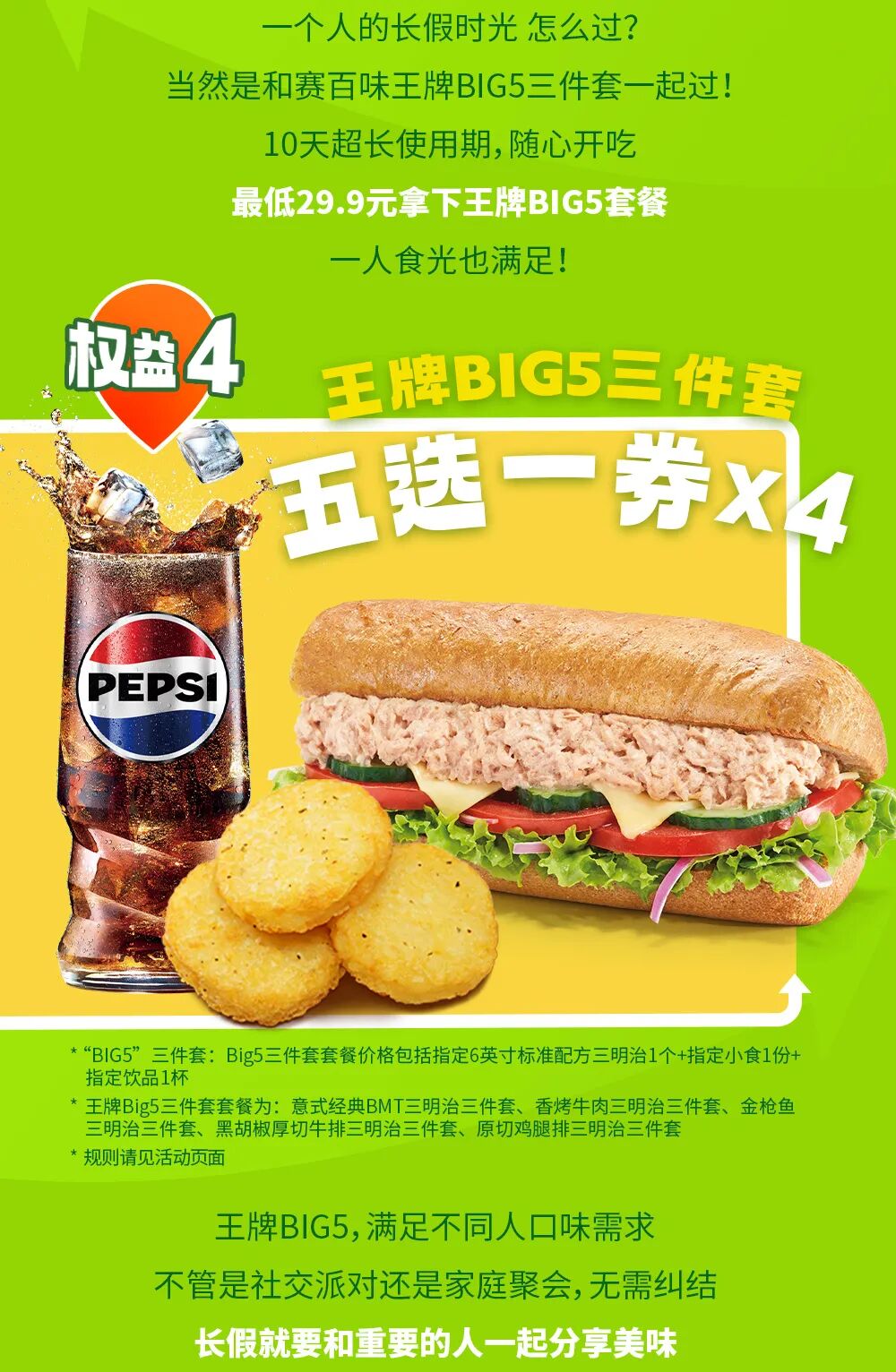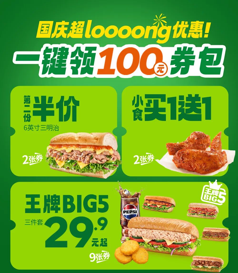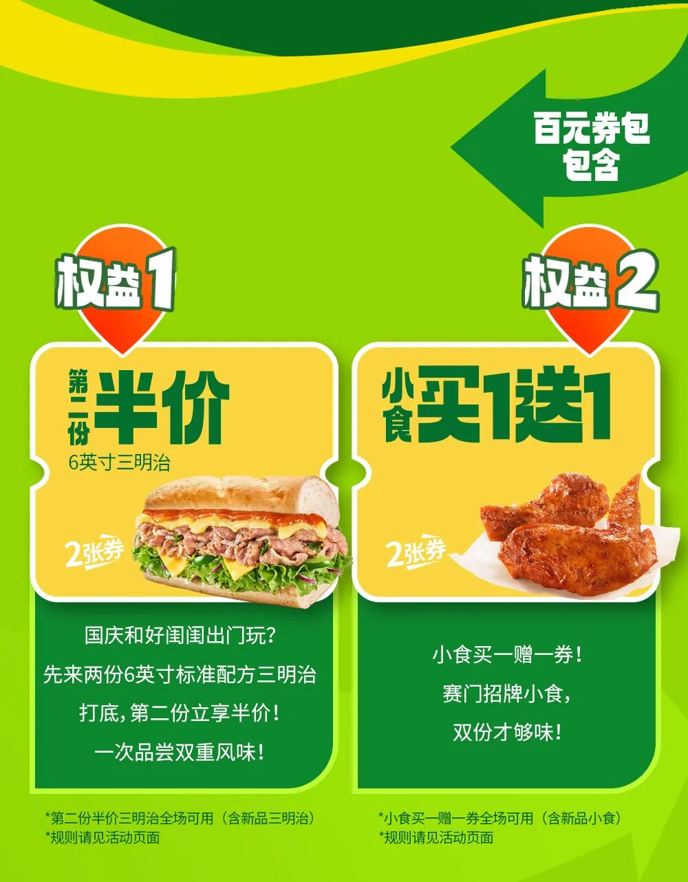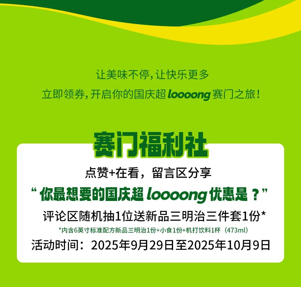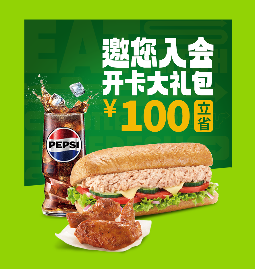*上述产品限2025年09月29日到2025年10月08日于SUBWAY®赛百味中国大陆地区部分餐厅供应,机场、火车站等交通枢纽餐厅、旅游景区餐厅、园区内部餐厅等特殊餐厅除外,具体以餐厅公示为准。产品以实物为准,以上为创意图片,仅供参考。SUBWAY*赛百味可以在法律允许的范国内对活动进行适当调整。Subway® is a Registered Trademark of Subway IP LLC © 2025 Subway IP LLC.